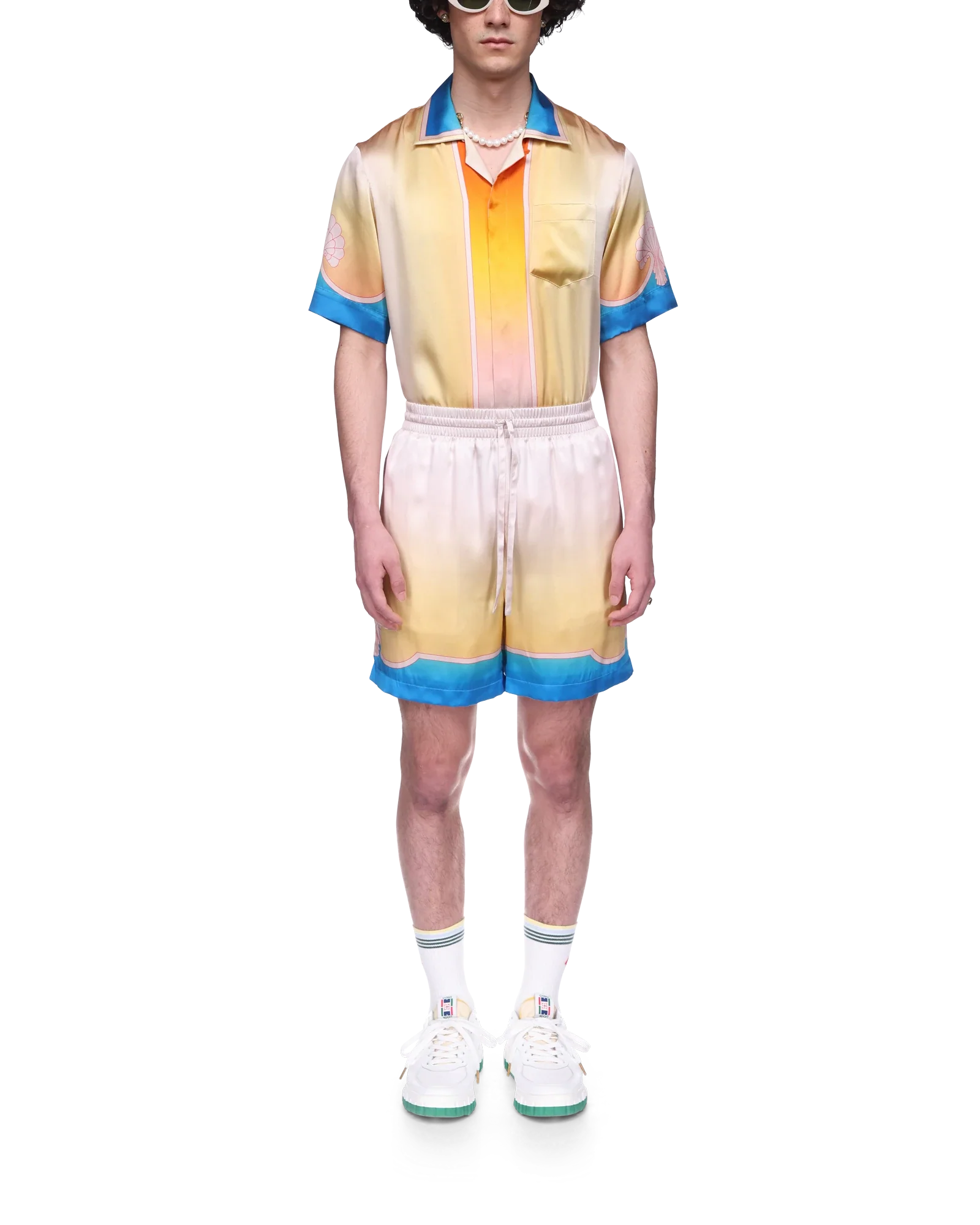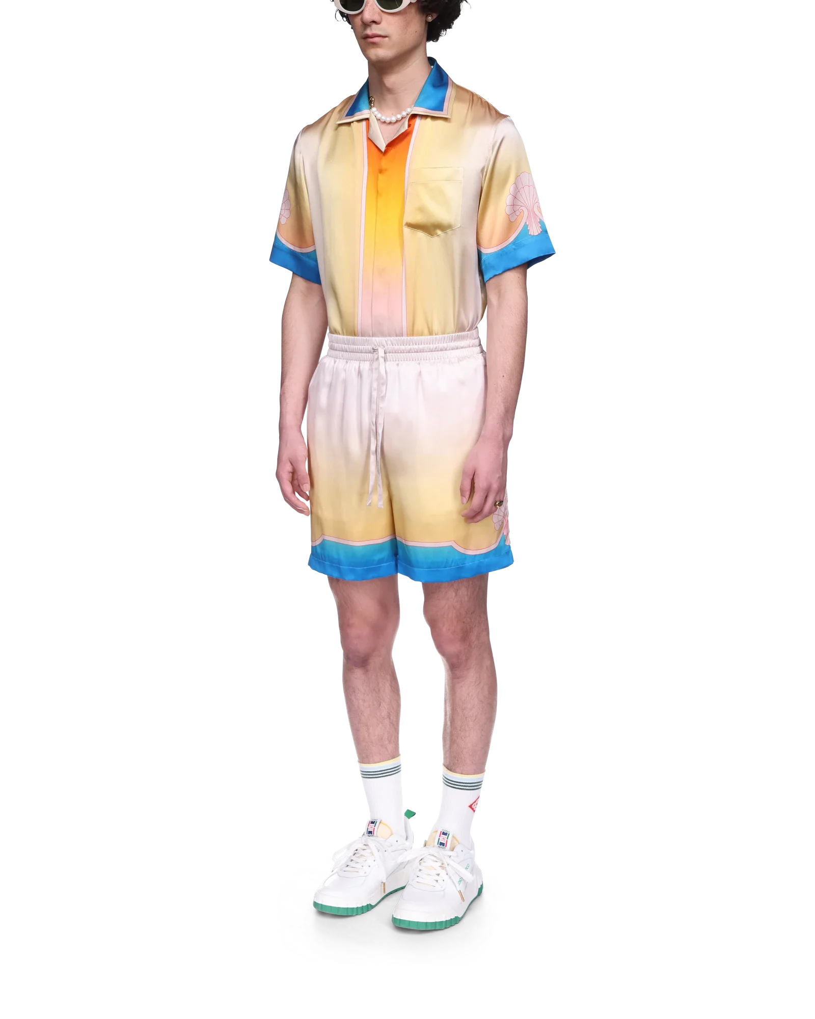 The L’Arc Coloré silk shorts are a familiar design crafted from printed silk satin fabric and feature the house’s signature gradient print and shell artwork. The colour palette for this collection is light and idealistic. emphasising ethereal themes core to our brand. Completed with stripe edge detail that forms into shell motifs on the hem. an elasticated waistband with drawstring fastening. side pockets. and a back pocket.