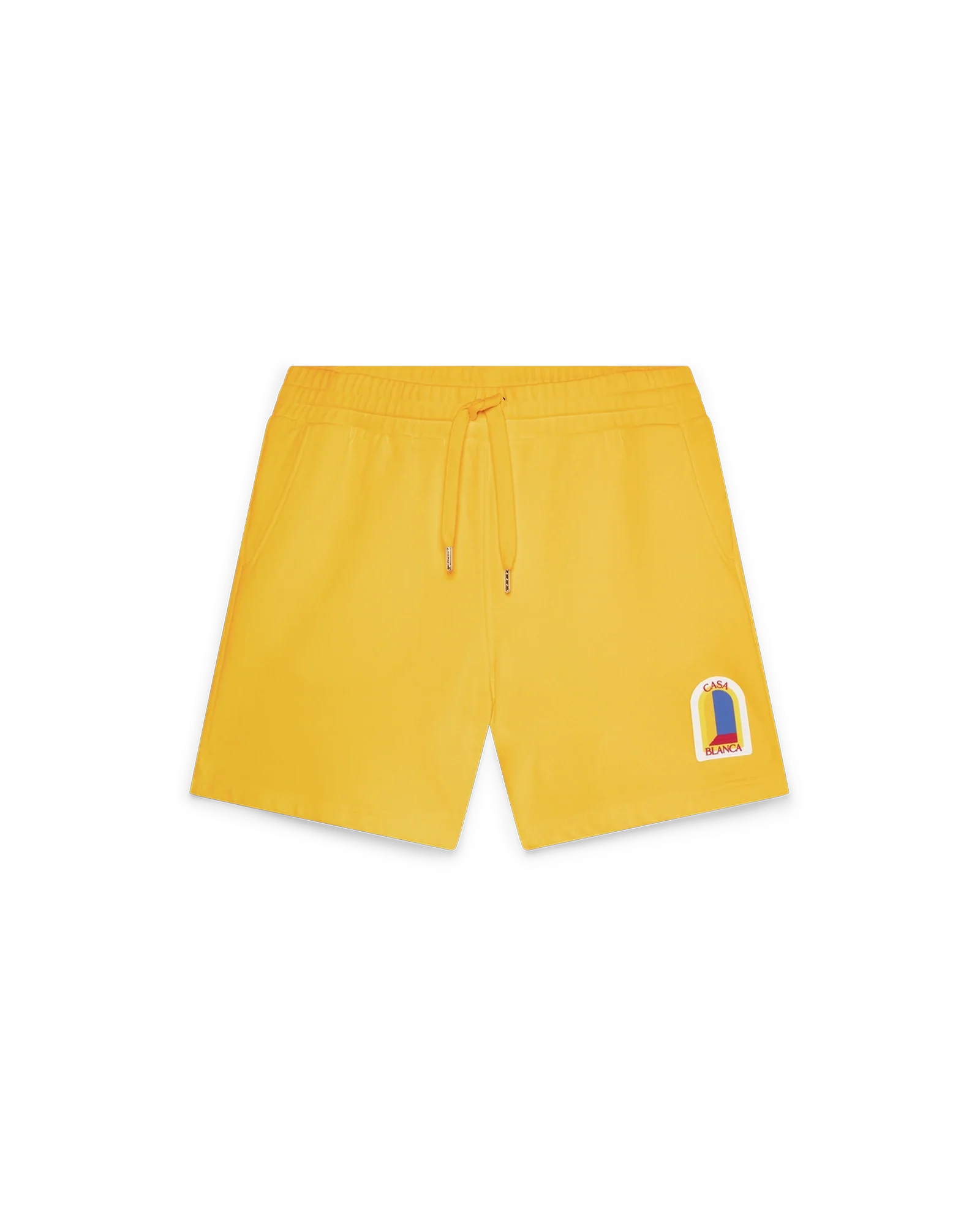 L’Arche De Jour patch sweatshorts feature the arch artwork of the season in a daytime colourway of warm yellows and oranges. Finished with an elasticated waistband. gold-tipped drawstring fastening. side and a back pocket.