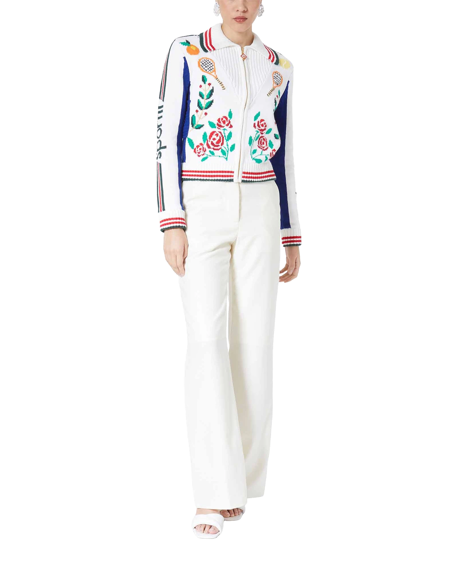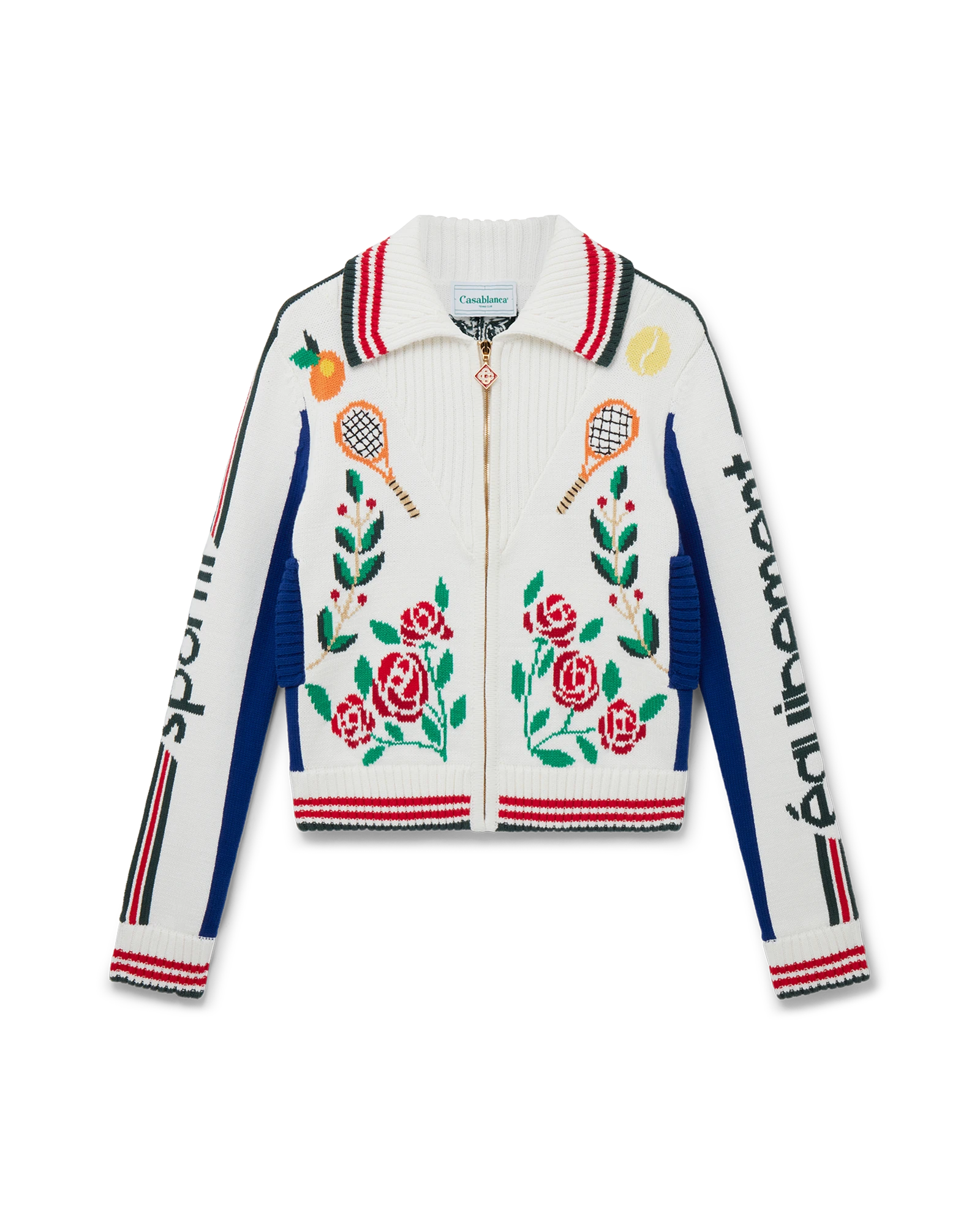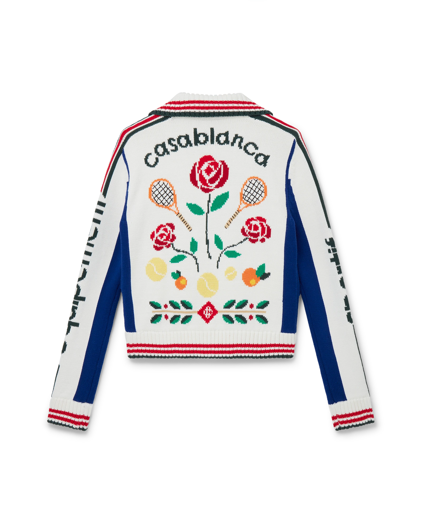 The laurel intarsia zip-up knit jacket is a vibrant lightweight jacket featuring the house’s signature symbology reinterpreted for this season. Crafted from a cotton knit and completed with a front zip closure and side pockets designed for a slim fit.