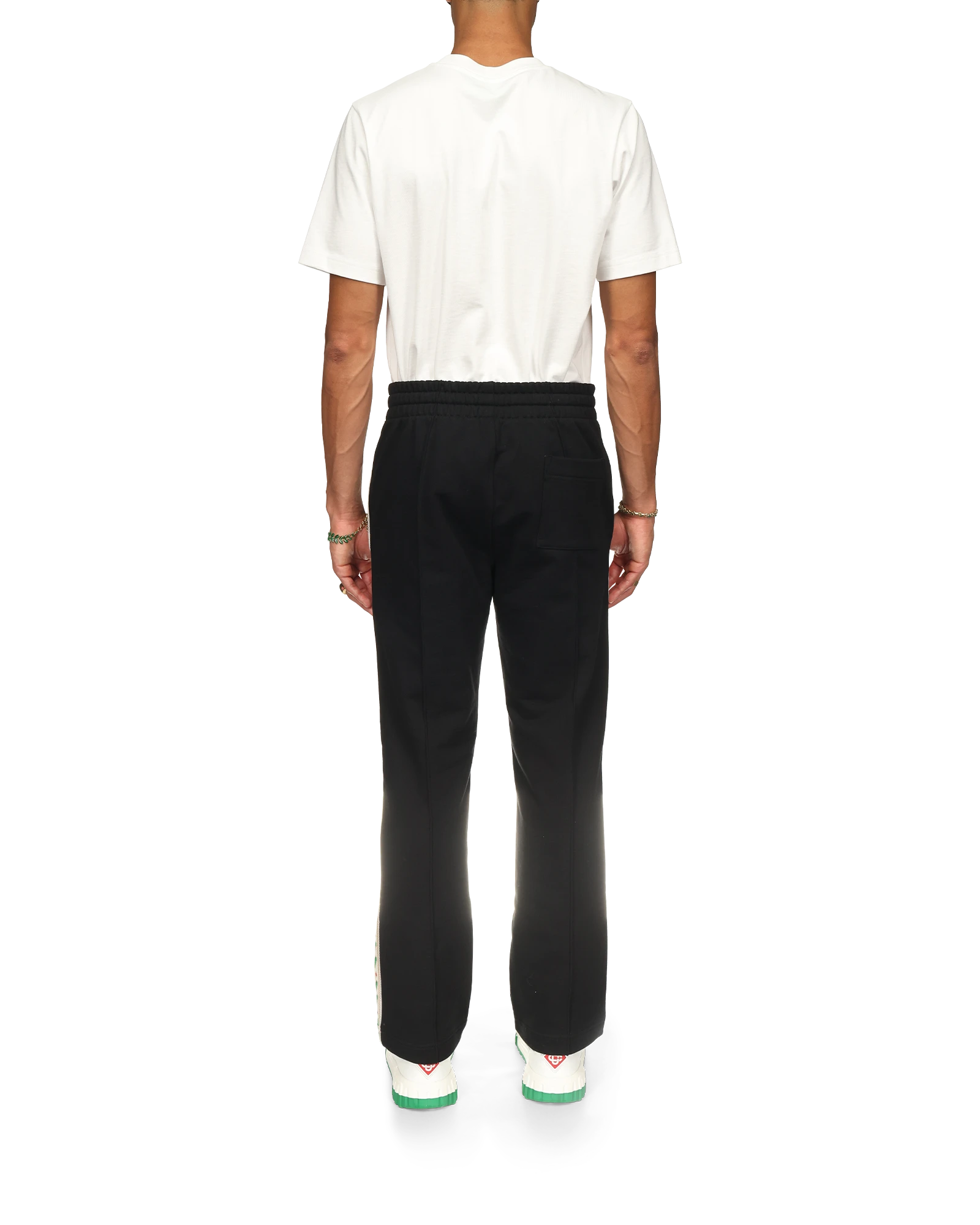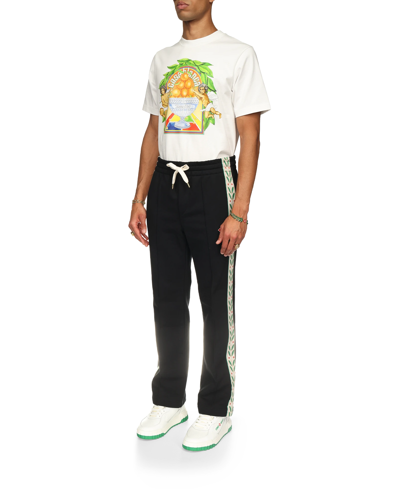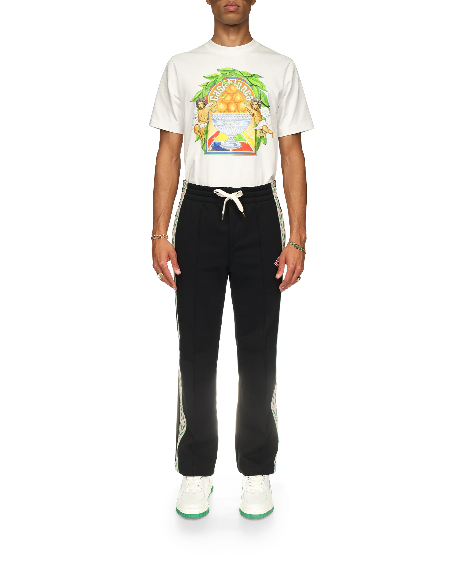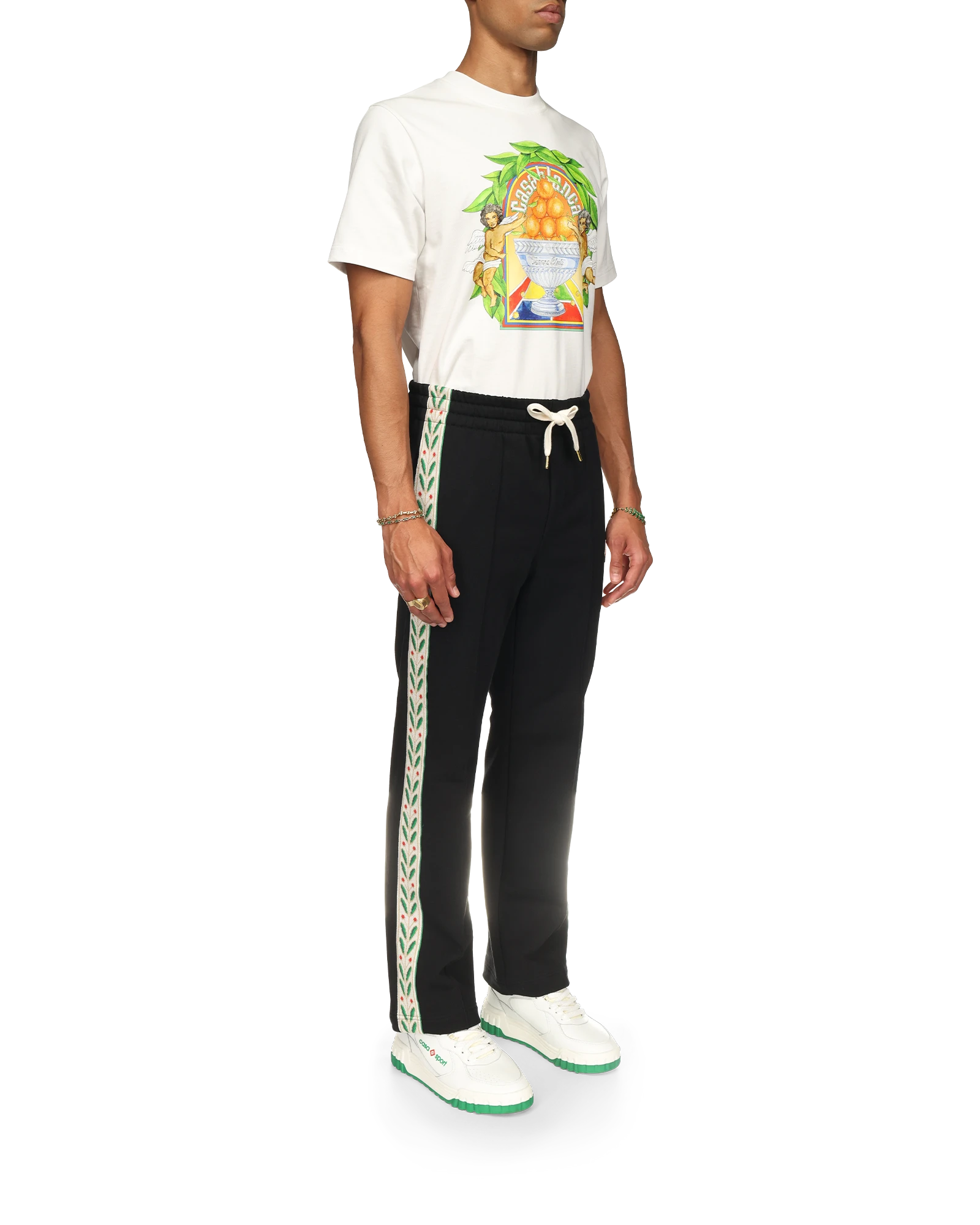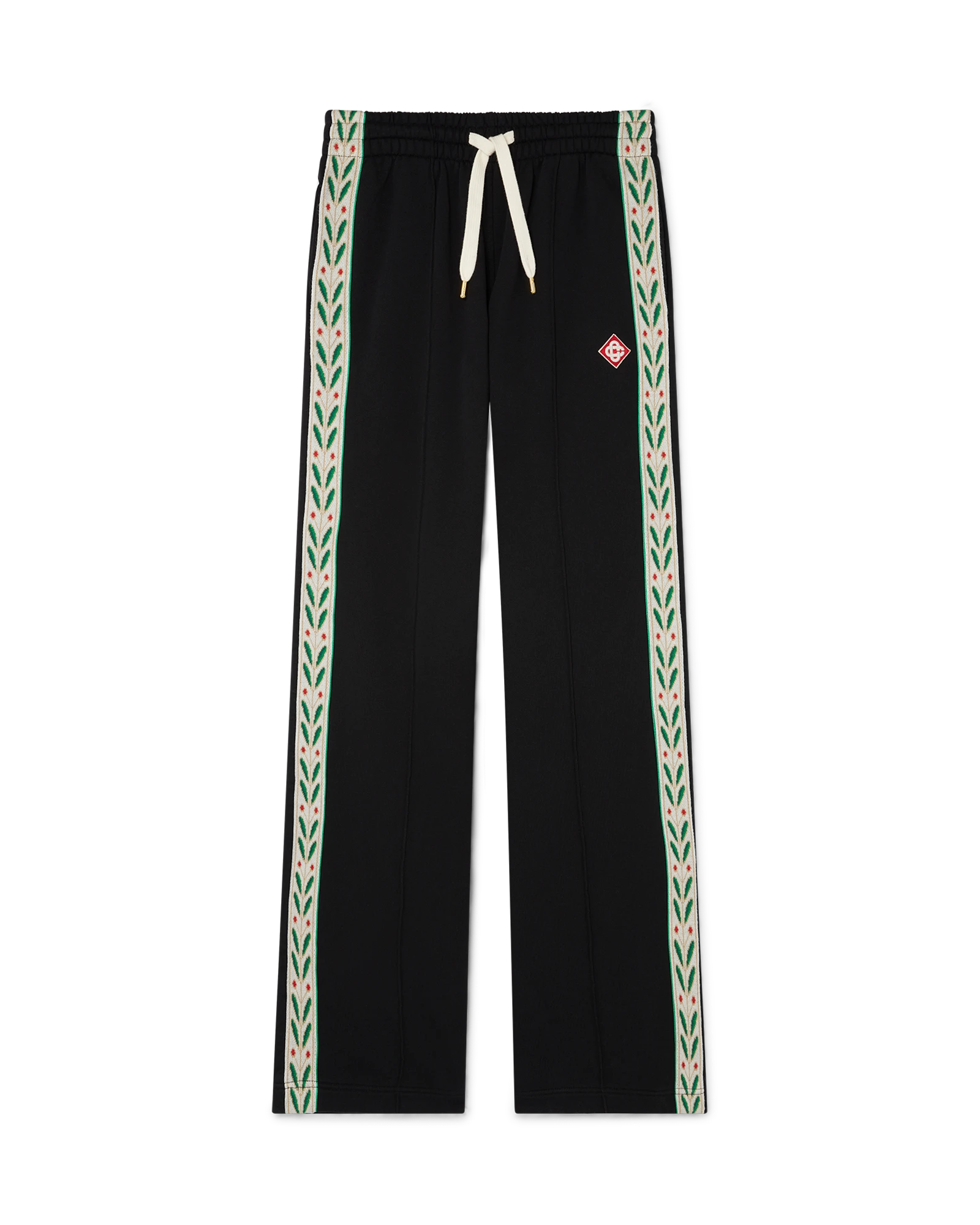 The Laurel panelled sweatpants are an elevated sportswear staple featuring the house’s signature laurel artwork on contrast ribbing with the diamond monogram on the left leg. Crafted from cotton fabric. this piece is finished with a pin-tuck front seam. an elasticated waistband. gold-tipped drawstring fastening. side pockets. a back pocket. and a Casablanca branded label.