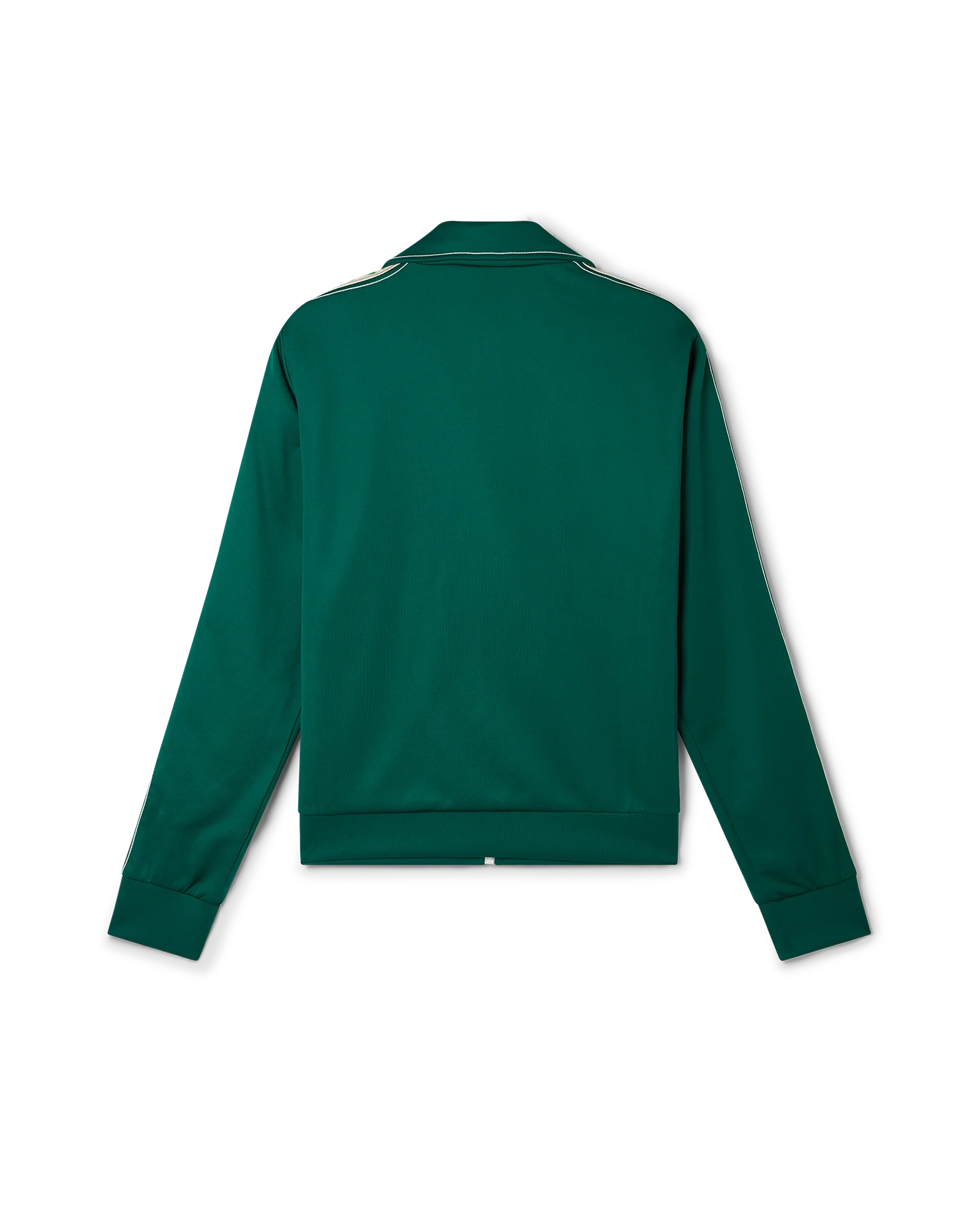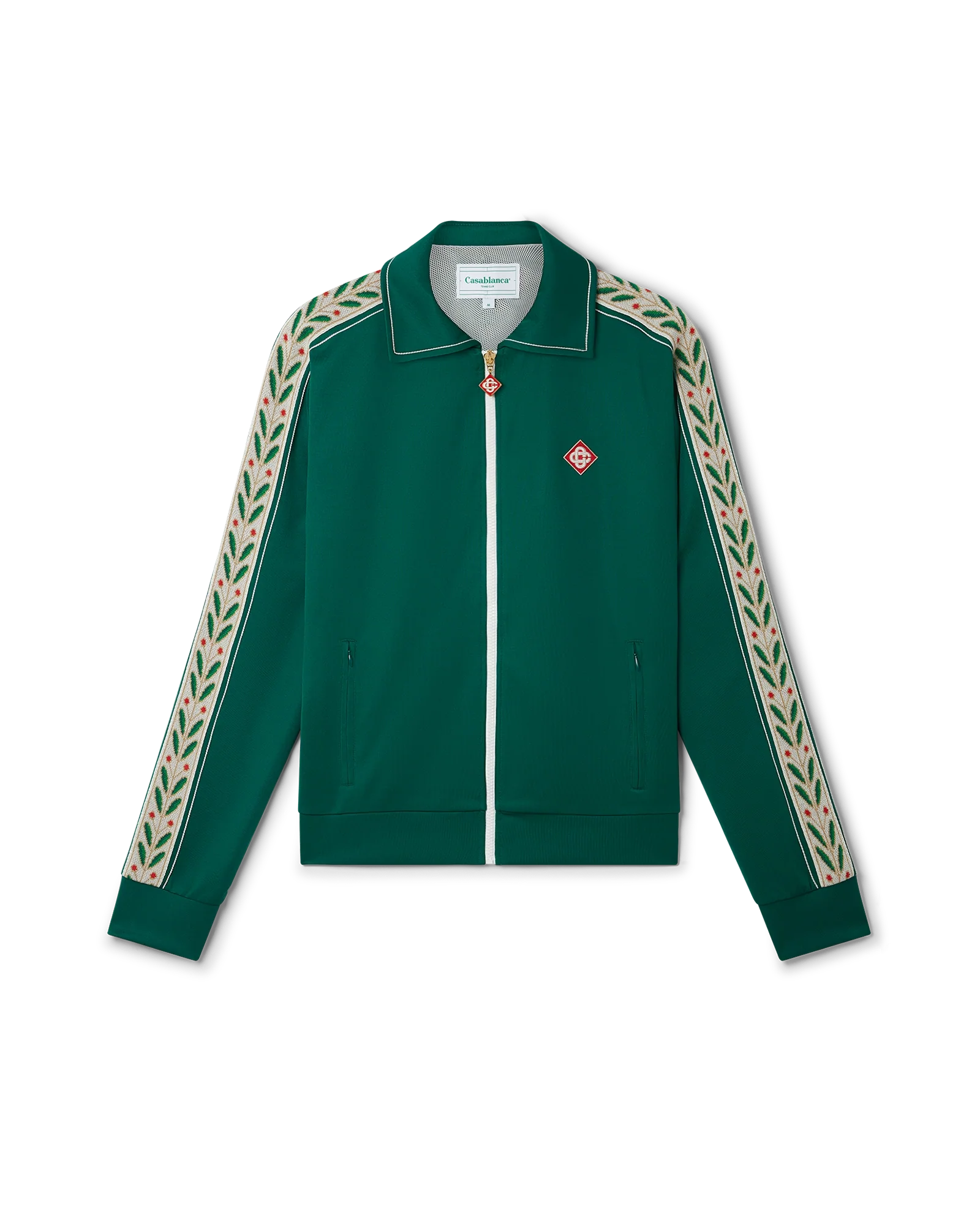 The Laurel track jacket is an elevated sportswear staple featuring the house’s signature laurel artwork on contrast ribbing and a diamond monogram logo. Crafted from a tricot fabric. the zip-up jacket has a classic Fits and side zip pockets. completed with a Casablanca branded label.