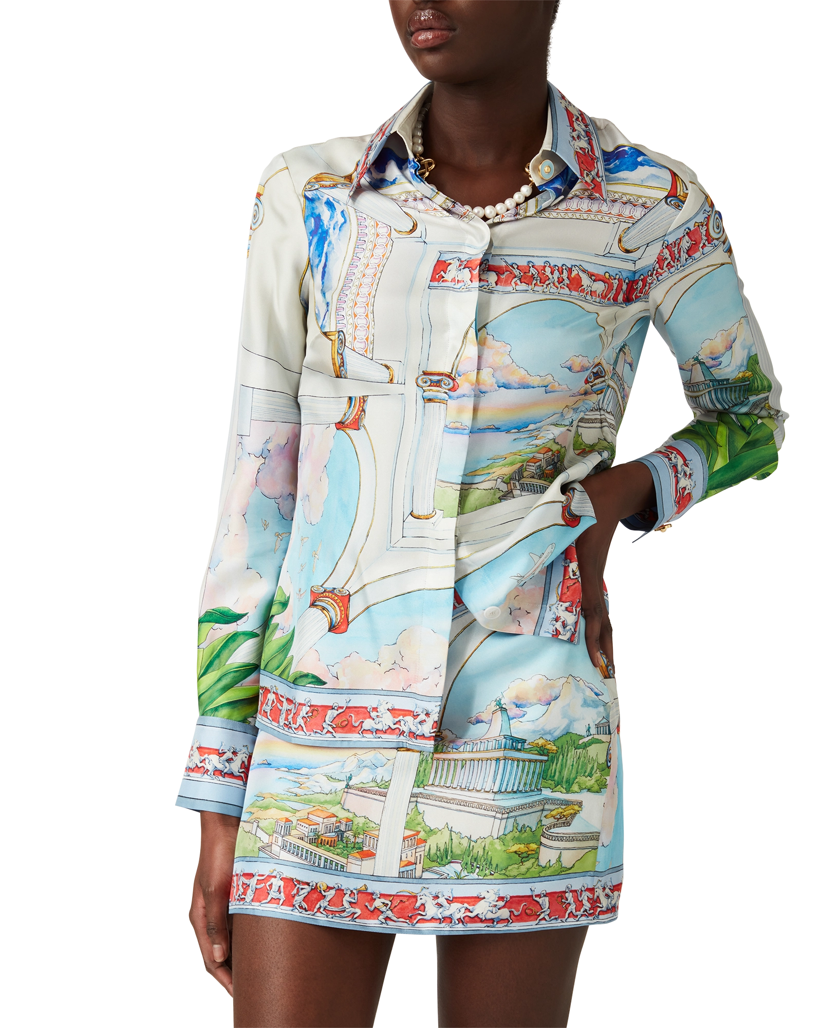 The Le Passage mini silk skirt is a short-style A-line design crafted from silk twill fabric featuring the house’s seasonal artwork – presenting four different dimensions playing on perspectives and architecture. Completed with a zip closure and Greek key-inspired edge detail on the hem.