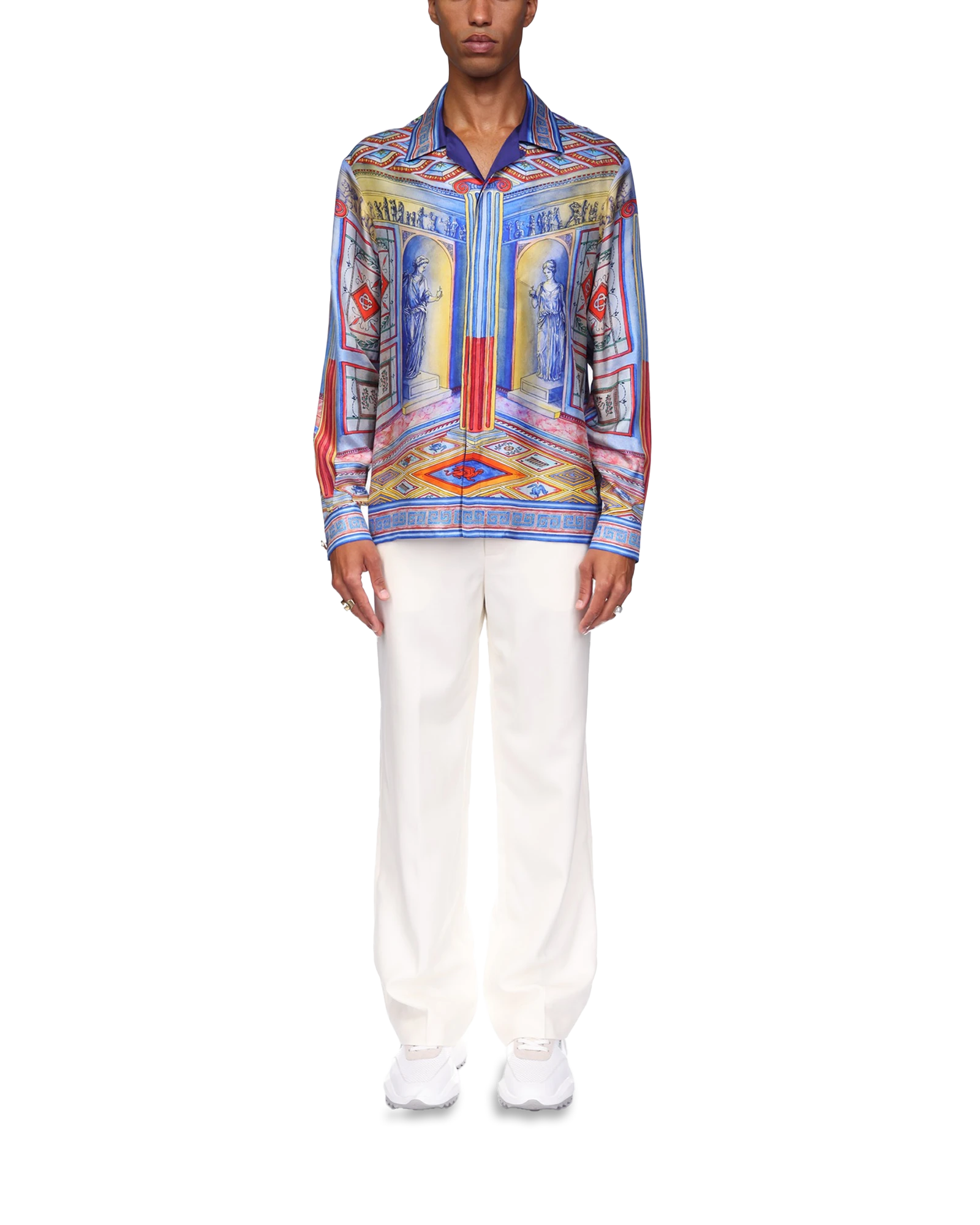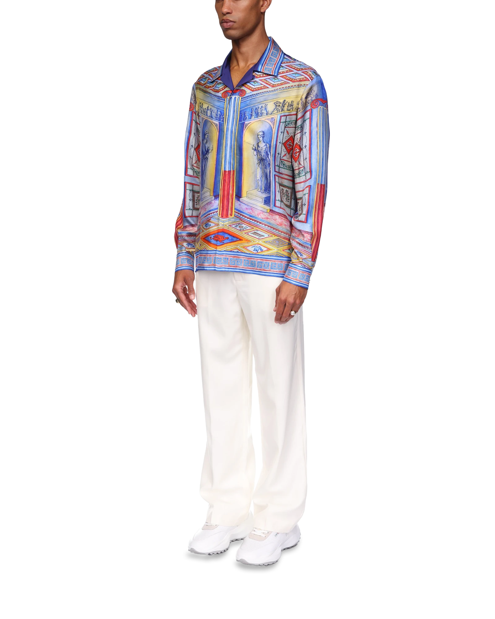 The Le Temple silk shirt is a long-sleeved all-over printed design crafted from a silk twill fabric featuring the house’s first print of the season. inspired by a softly lit temple at night. showing the beauty of the interior and the floor. Completed with the house’s signature gold-rim pearl buttons. button closure. a Cuban collar. and Greek key detail on the collar. cuffs. and hem.