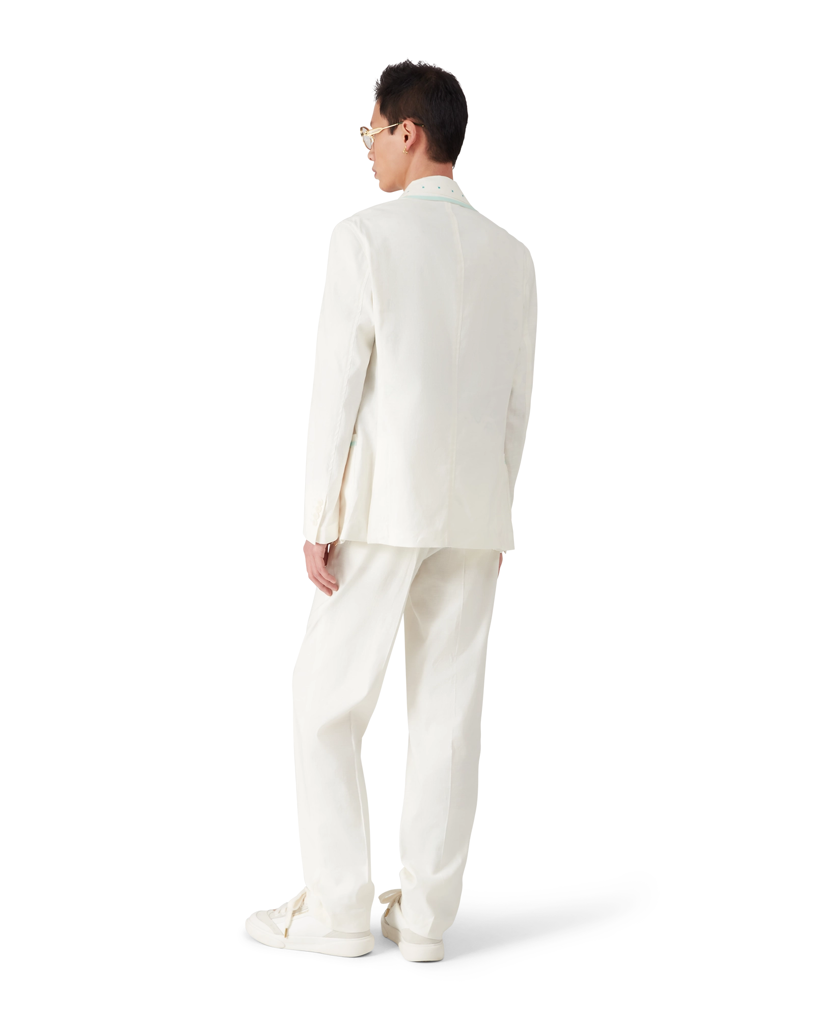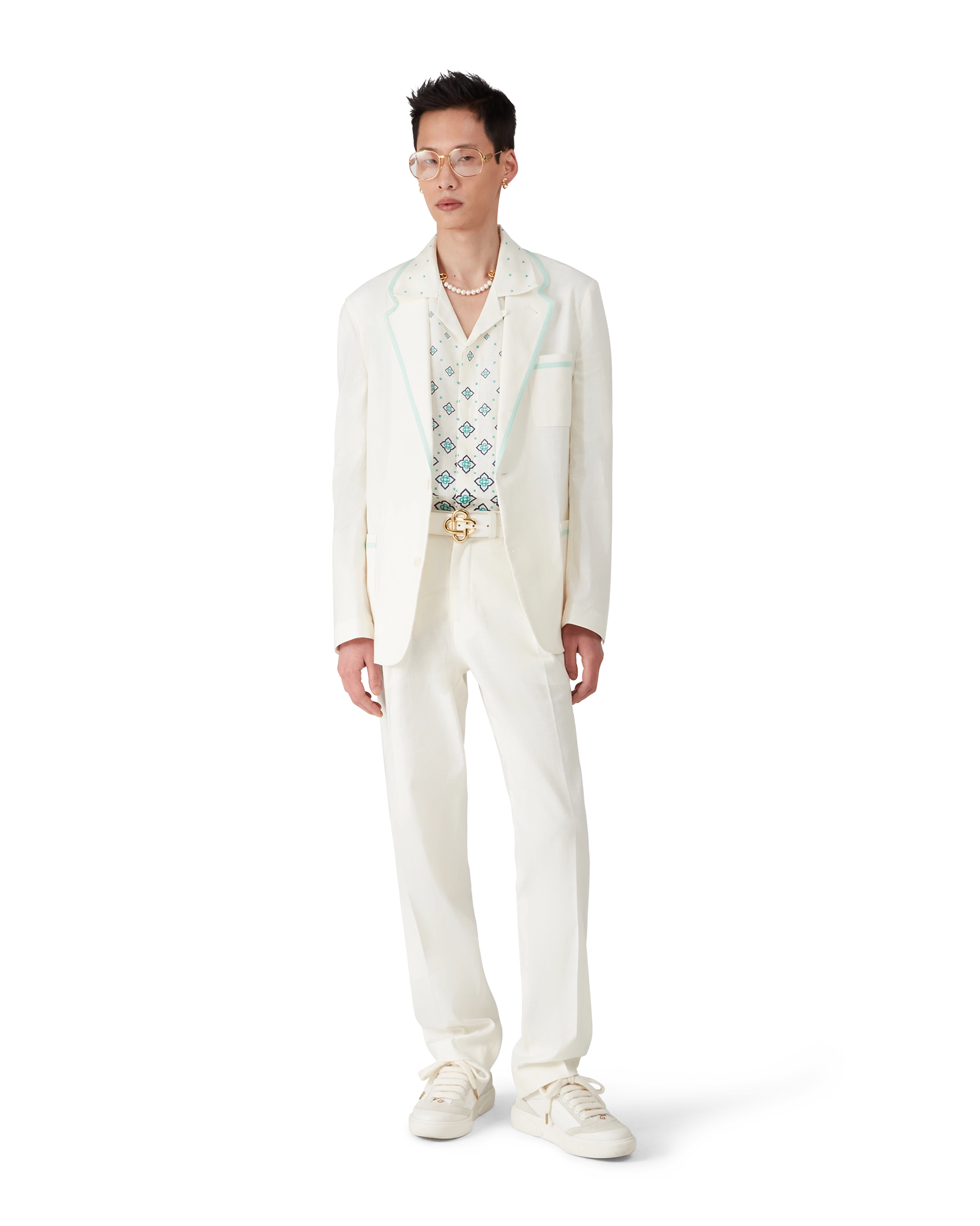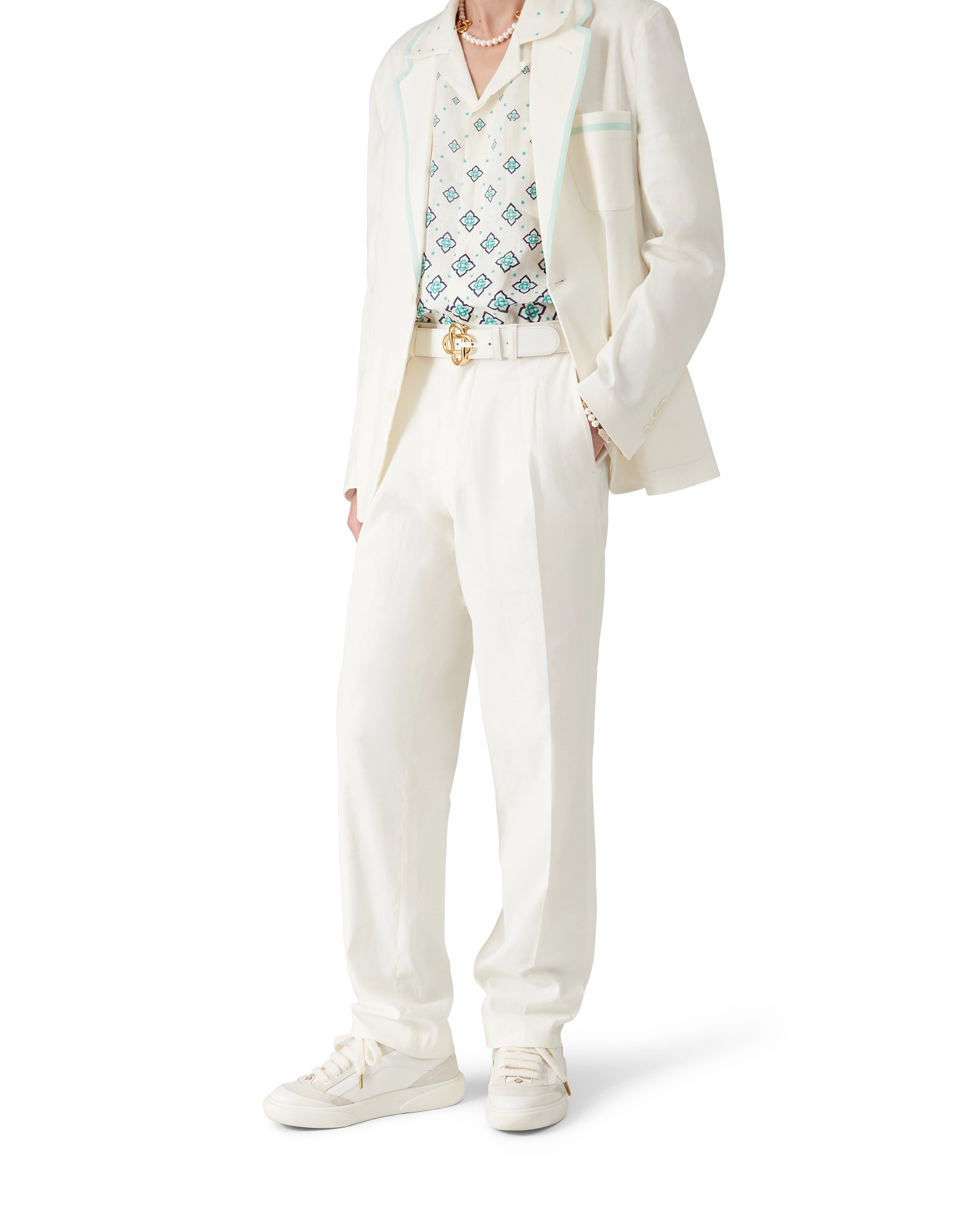 The linen pleated trousers are a tapered design crafted from linen fabric. Completed with zip closure. slanted front pockets. welt back pocket. belt loops. and pleats.