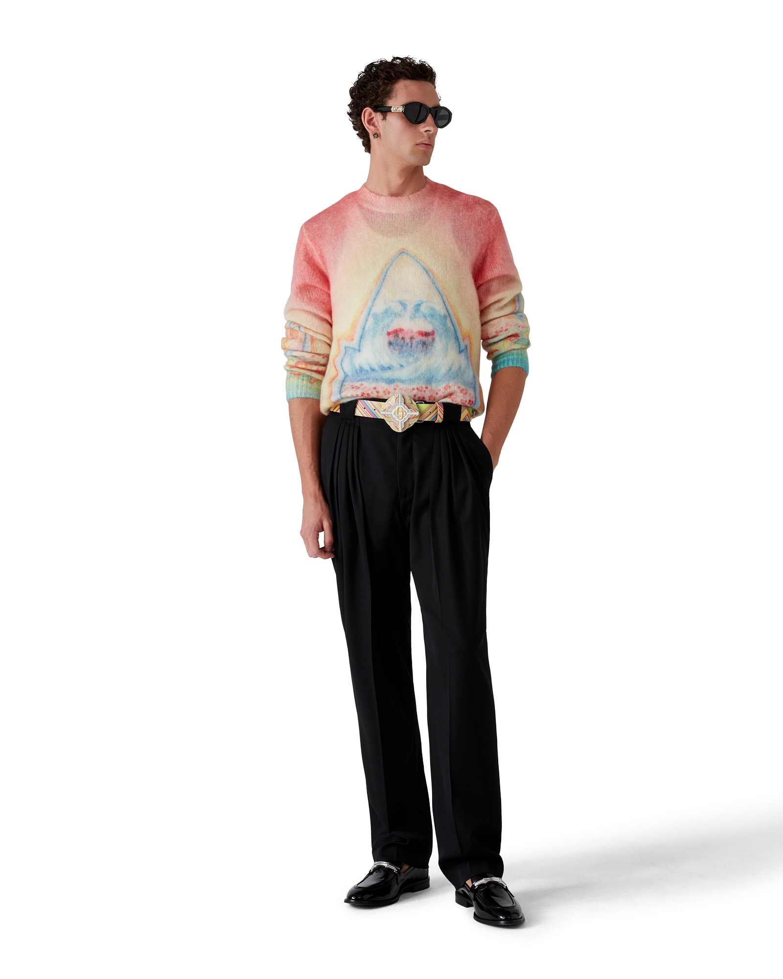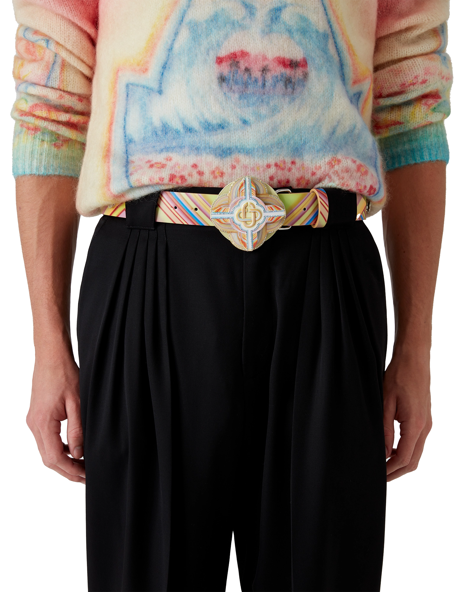 The Low Rider belt is a multicoloured design referencing the pop colours and airbrushing painting techniques used on low rider cars. Completed with the Casablanca logo along the length of the belt and on the buckle. a spinner disc. and crystals.