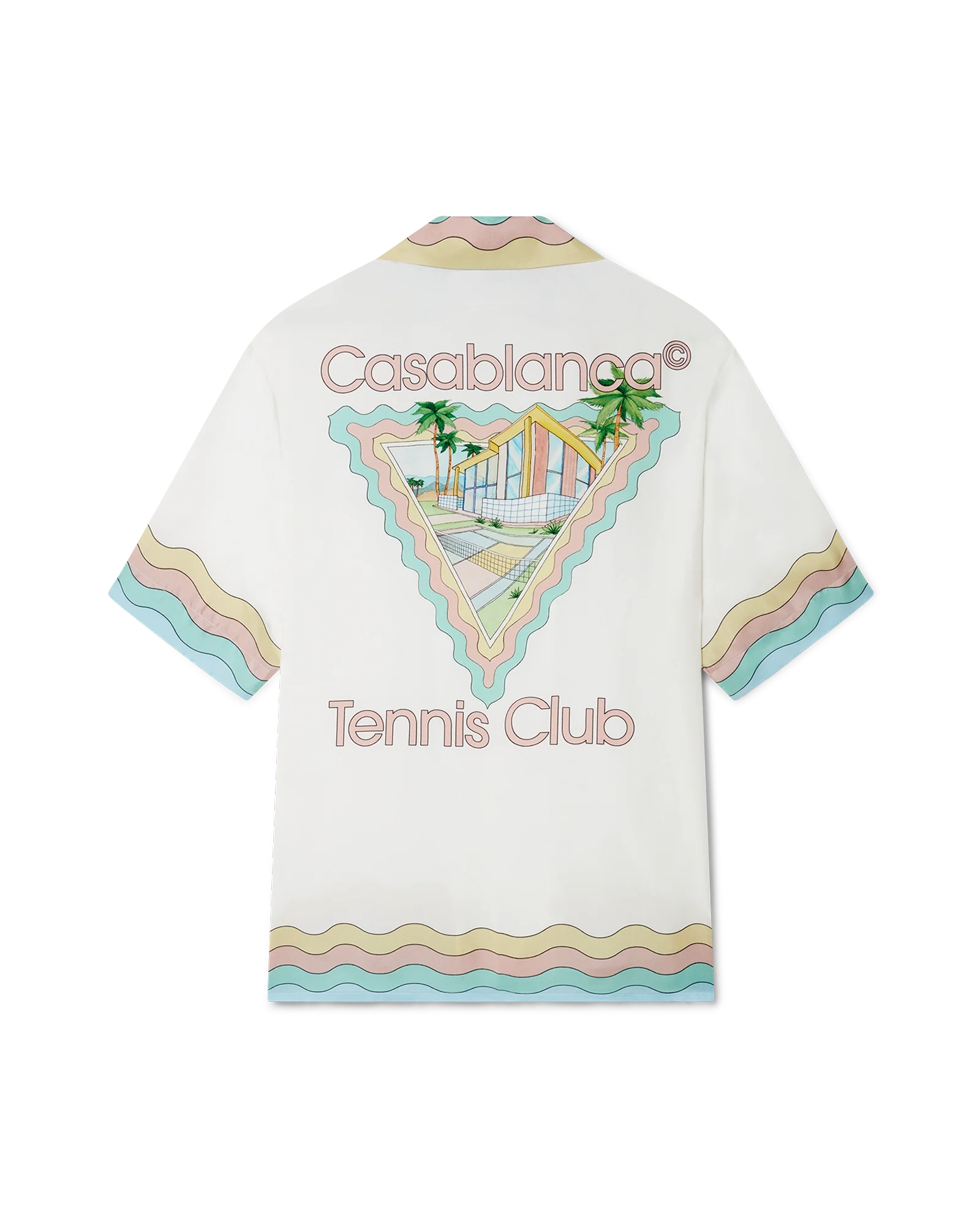 The Maison De Reve silk shirt is a short-sleeve design crafted from a silk twill fabric featuring seasonal artwork with references from a mid-century Palm Springs home and signature design elements – palm trees and a tennis court – in this season’s pastel colours. Completed with a front button closure. Cuban collar. breast pocket and Memphis wave-inspired stripe details which serve as a foundational design element. on the cuffs. collar. hem and breast pocket.