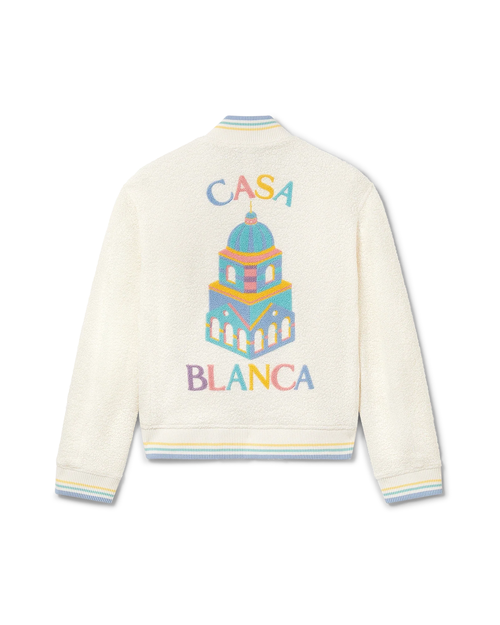 The Maison Pastelle bomber jacket is an embroidered classic design crafted from a cashmere terry wool blend fabric. This piece features one of the brands most recognisable elements; the arch as well as a rounded dome. all inspired from ‘looking at the beauty of the world’ and stacked logo in pastel coloured chenille embroidery. The colour palette for this collection is light and idealistic. emphasising ethereal themes core to our brand. Completed with zip front closure featuring the signature interlocking CC logo. pastel colour striped detail on the rib collar. cuffs and hem. front flap pockets with gold-plated stud closure.