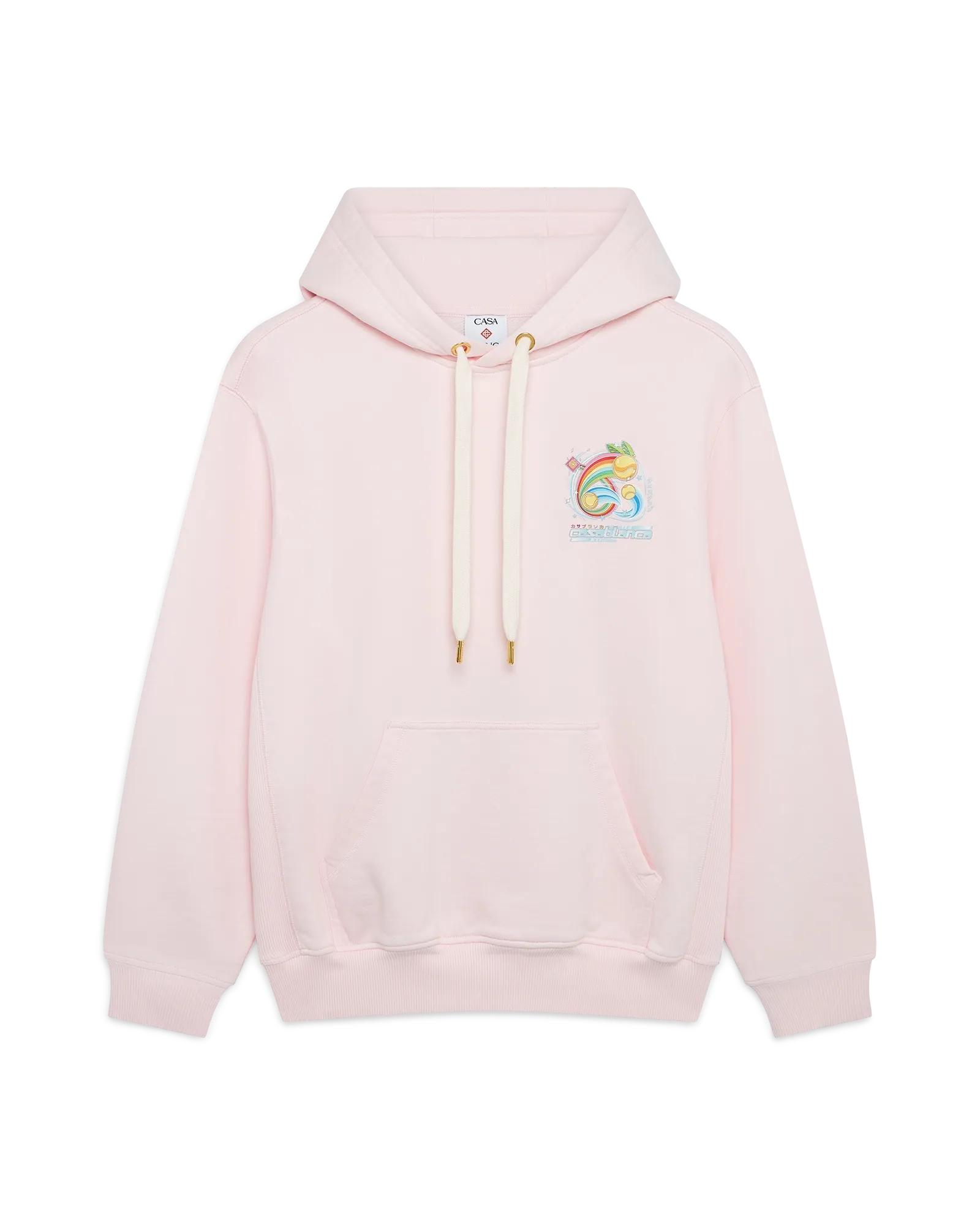 The Manga Tennis Ball hoodie is a long-sleeve. embroidered sportswear design featuring the season’s artwork exploring the world of Kawaii and Manga. playing with Casablanca’s iconography. using tennis balls as oranges for a fun twist. Completed with a hood. drawstring fastening. a kangaroo pocket. and rib cuffs and hem detail.