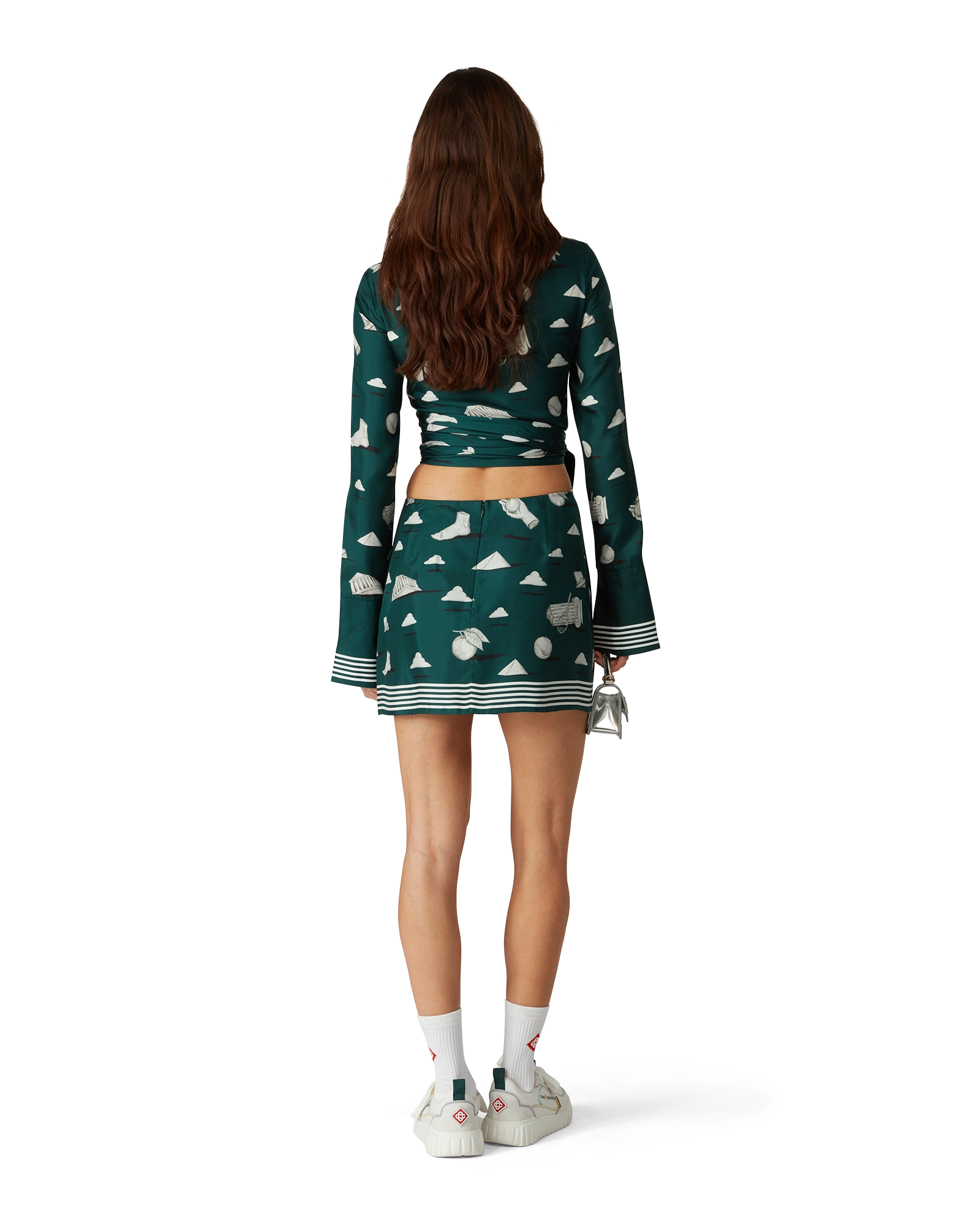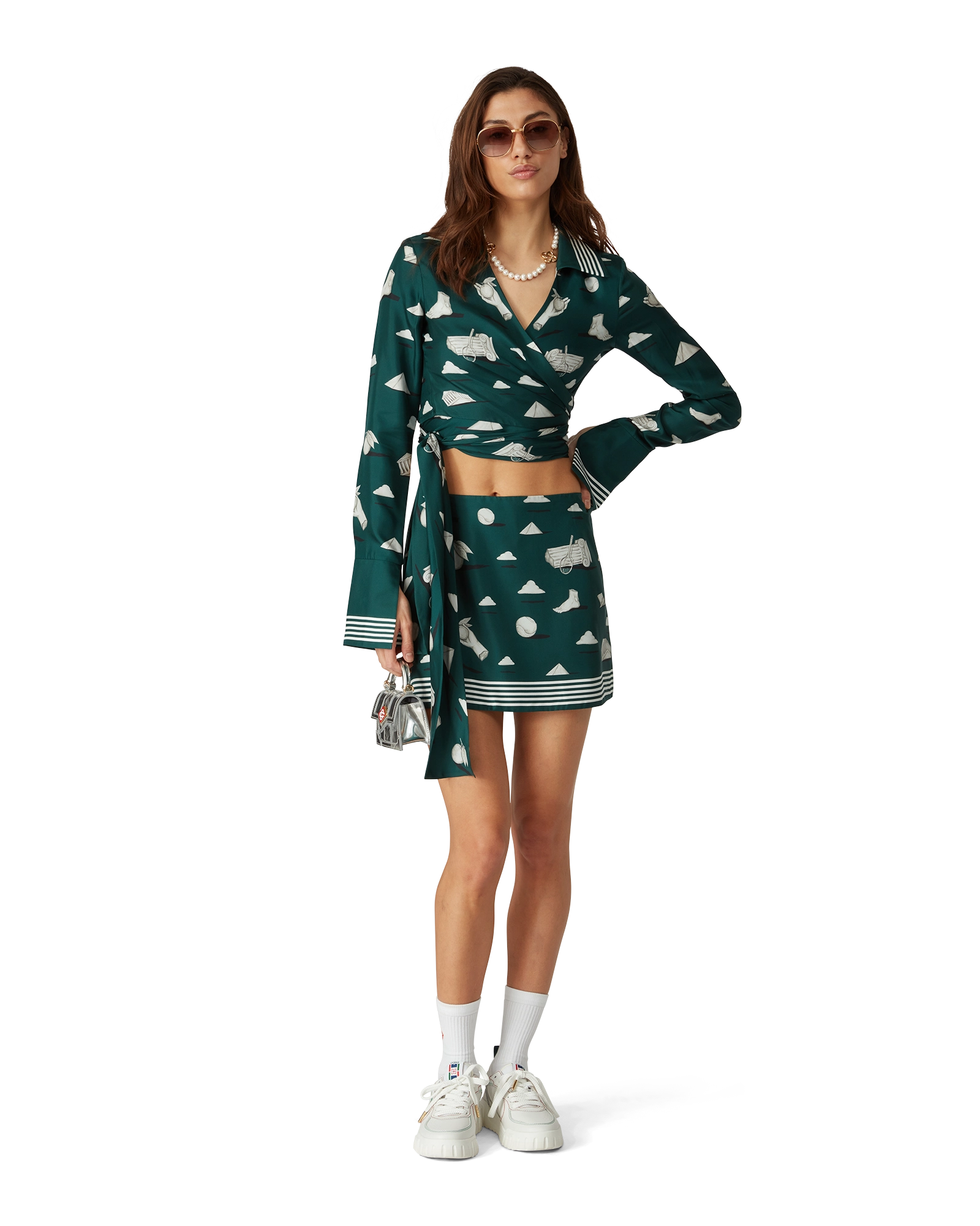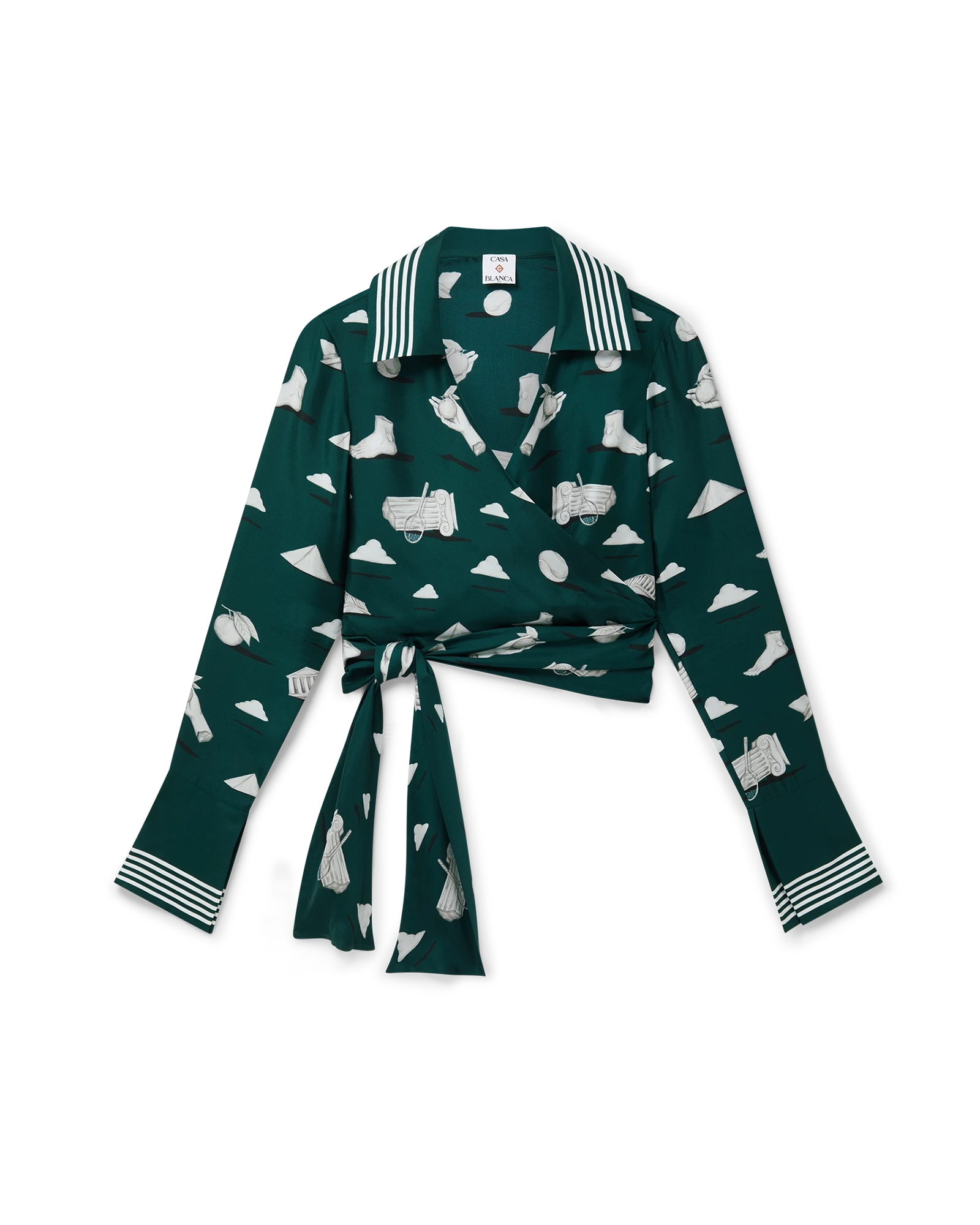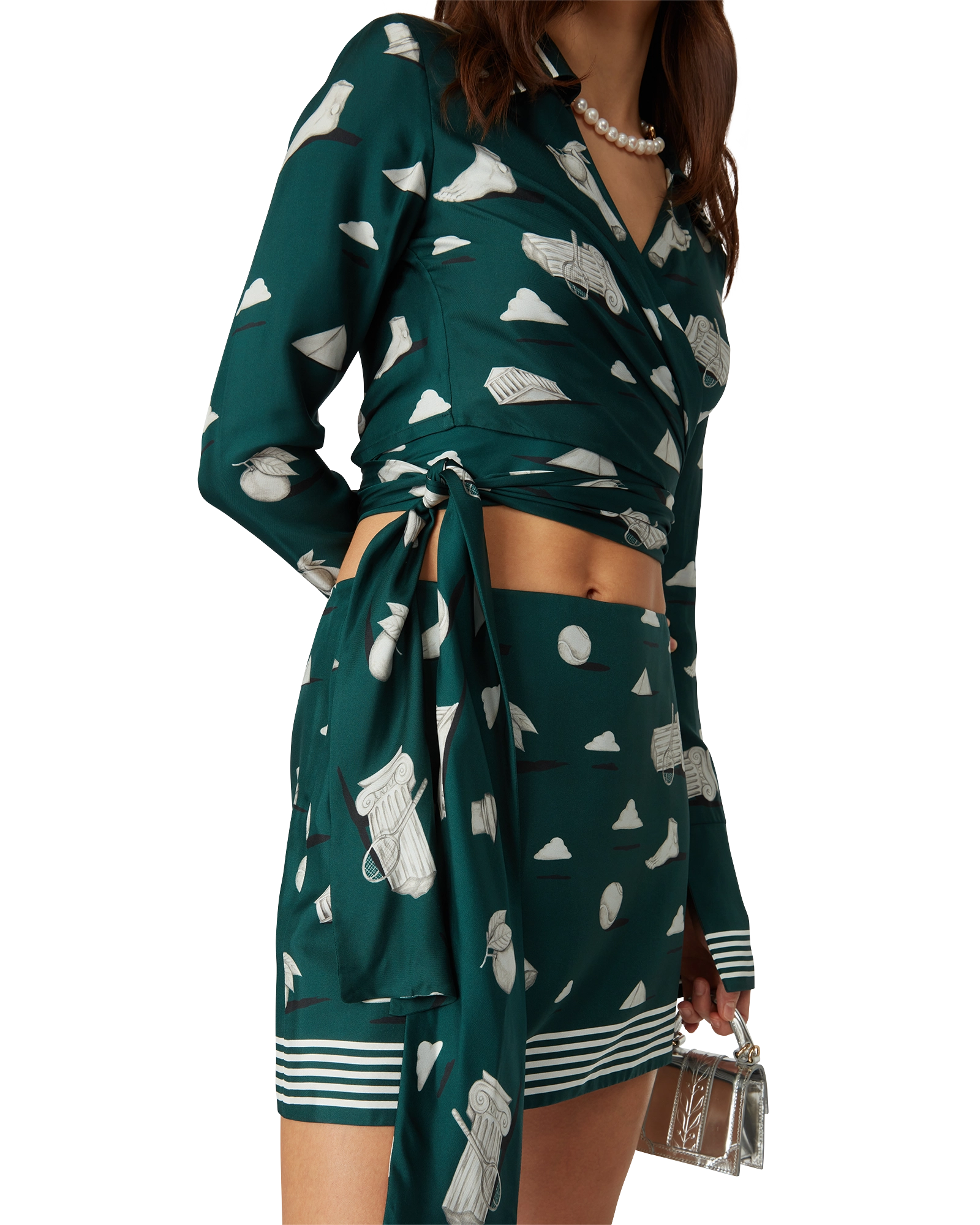 The Metaphysical silk wrap shirt is a long-sleeve all-over printed design. crafted from silk twill fabric. featuring repeat trompe l’oeil artwork of the stone effect with the light drawing of core design elements. Completed with a peak collar and flared slit sleeves with stripe edge detail. and a wrap-over closure.