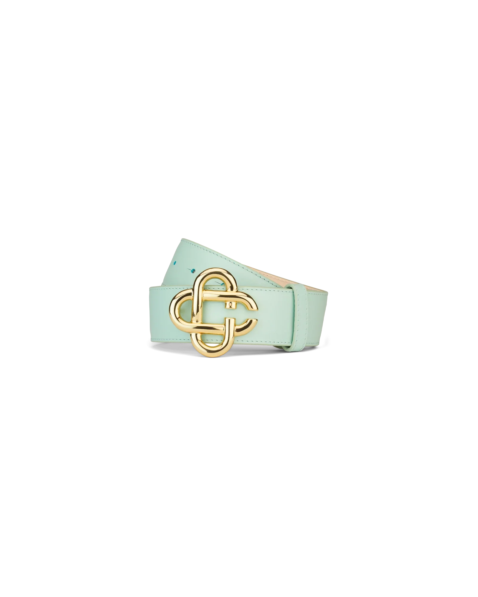 The mint leather belt features the house’s signature interlocking cc logo buckle with an Italian calf leather strap.
