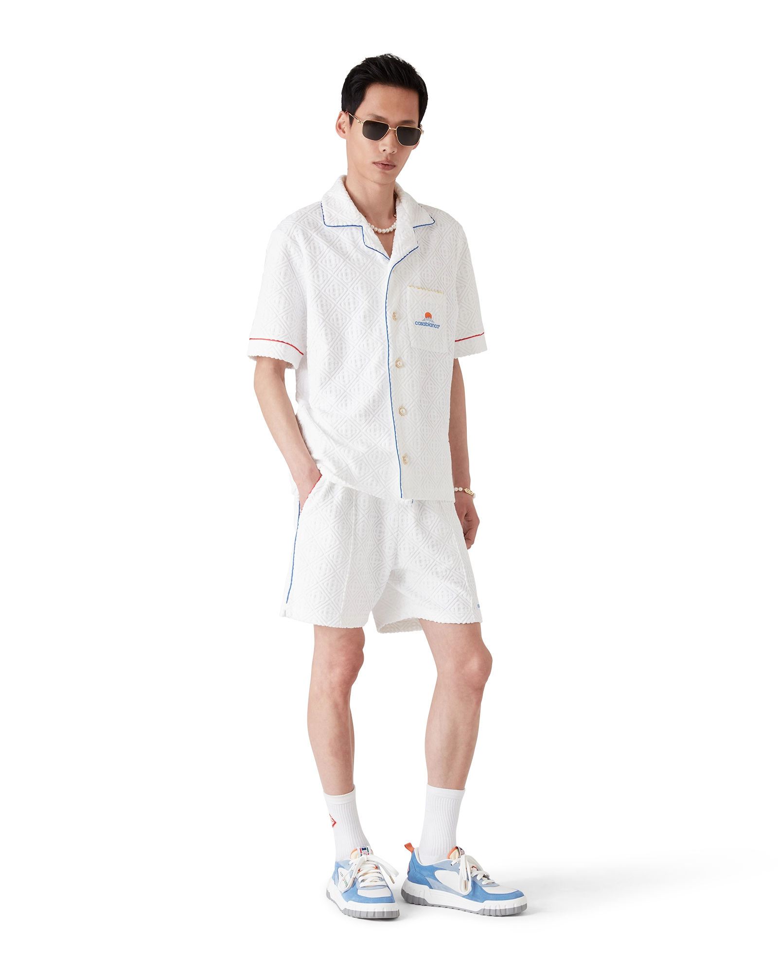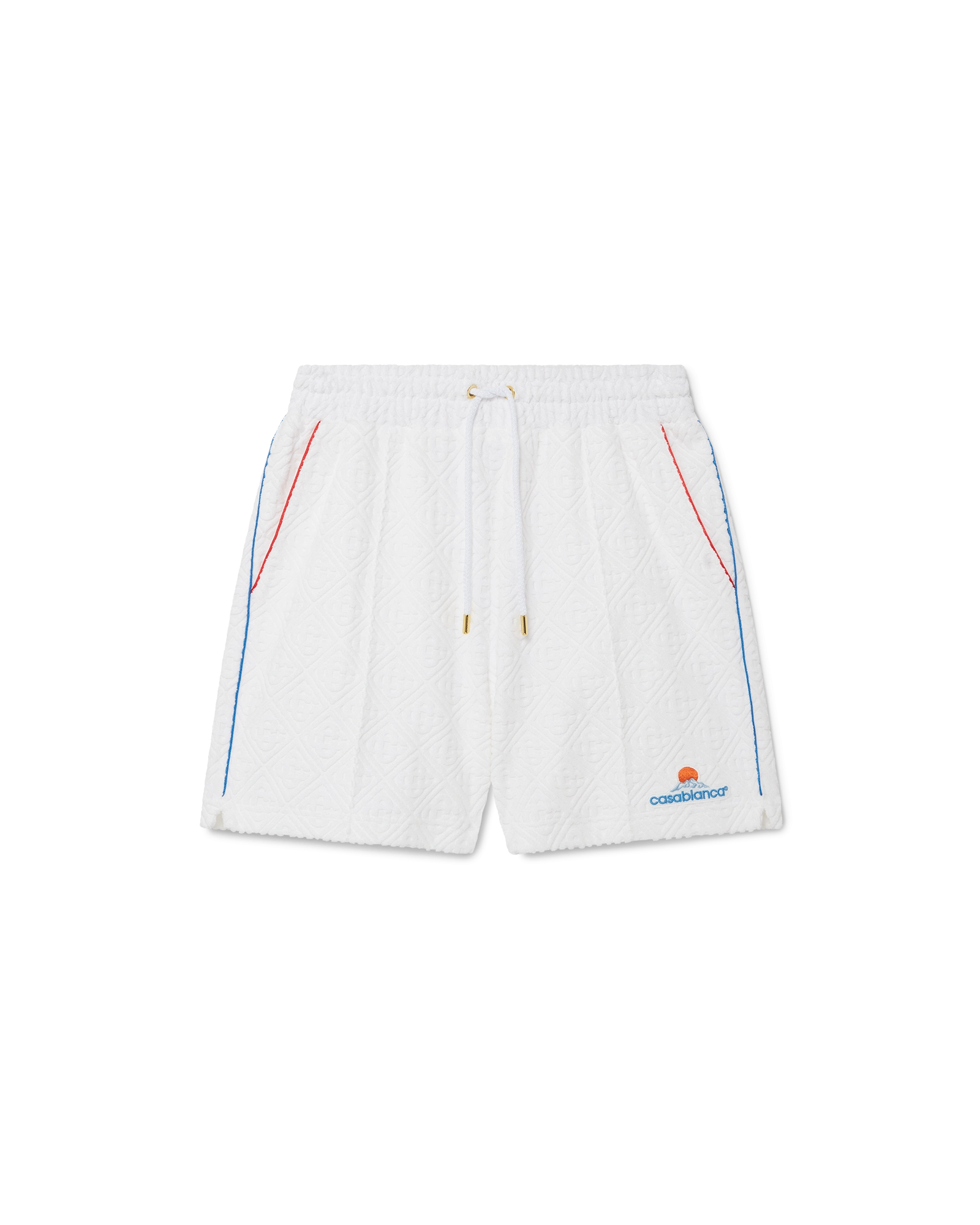 The Monogram towelling shorts are a classic design crafted from a monogram towelling fabric. Completed with an elasticated waistband. gold-tipped drawstring fastening. gold eyelets. pin tuck seams down the front. a back pocket. slanted front pockets. and piping details on the back and front pockets. and down the sides.