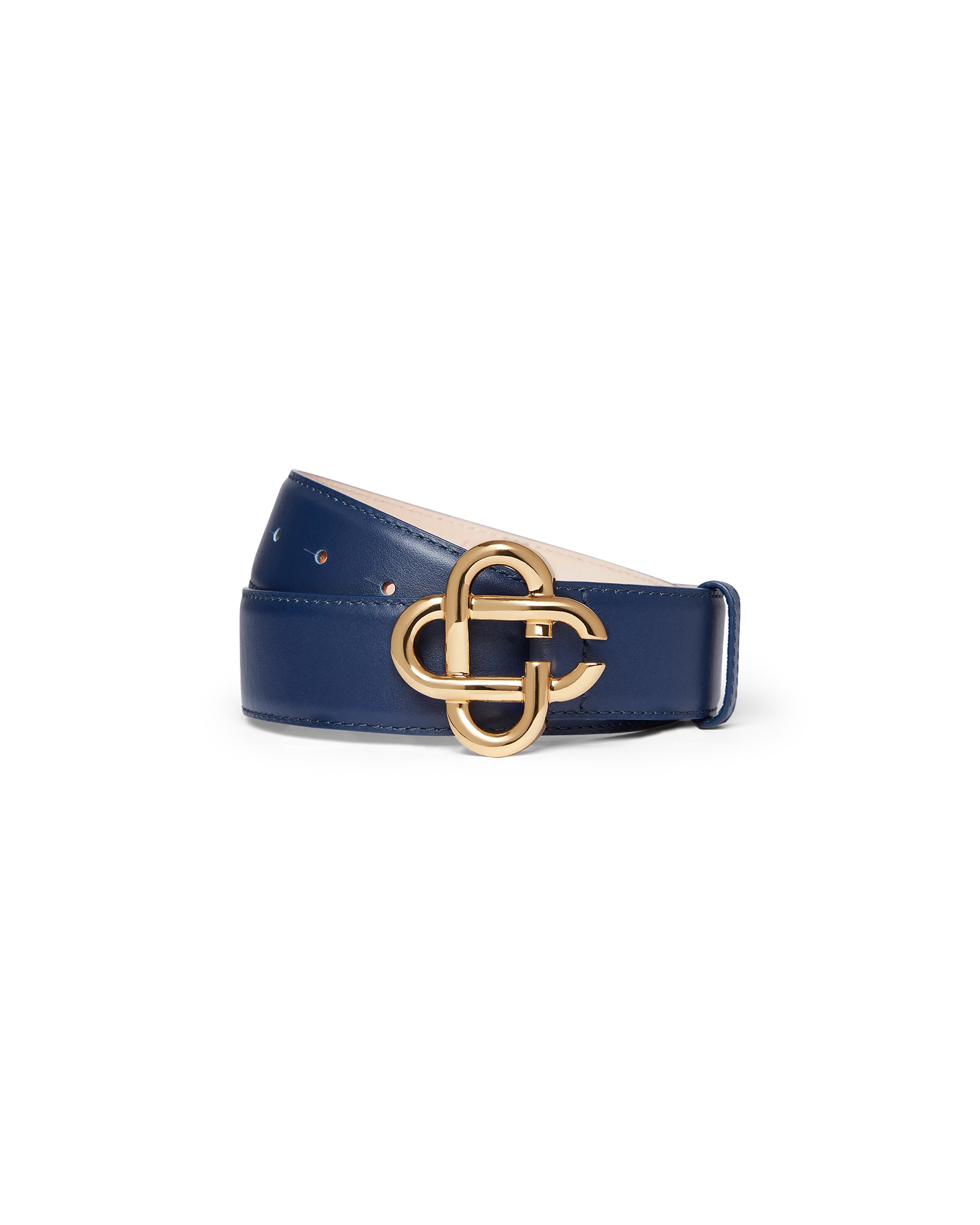 The navy CC buckle belt is crafted from Italian calf leather and features the house’s signature interlocking CC logo buckle. crafted from gold-plated brass.