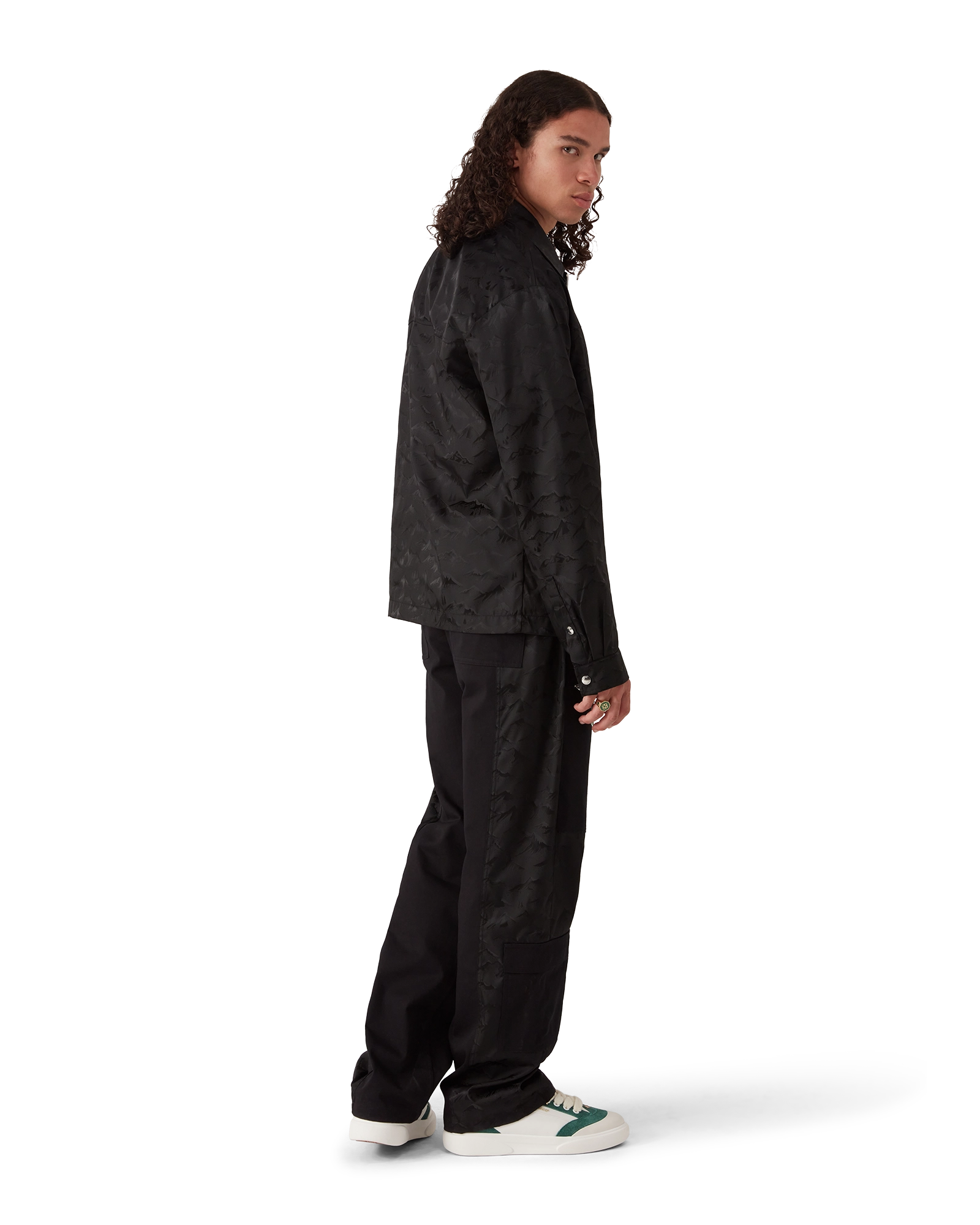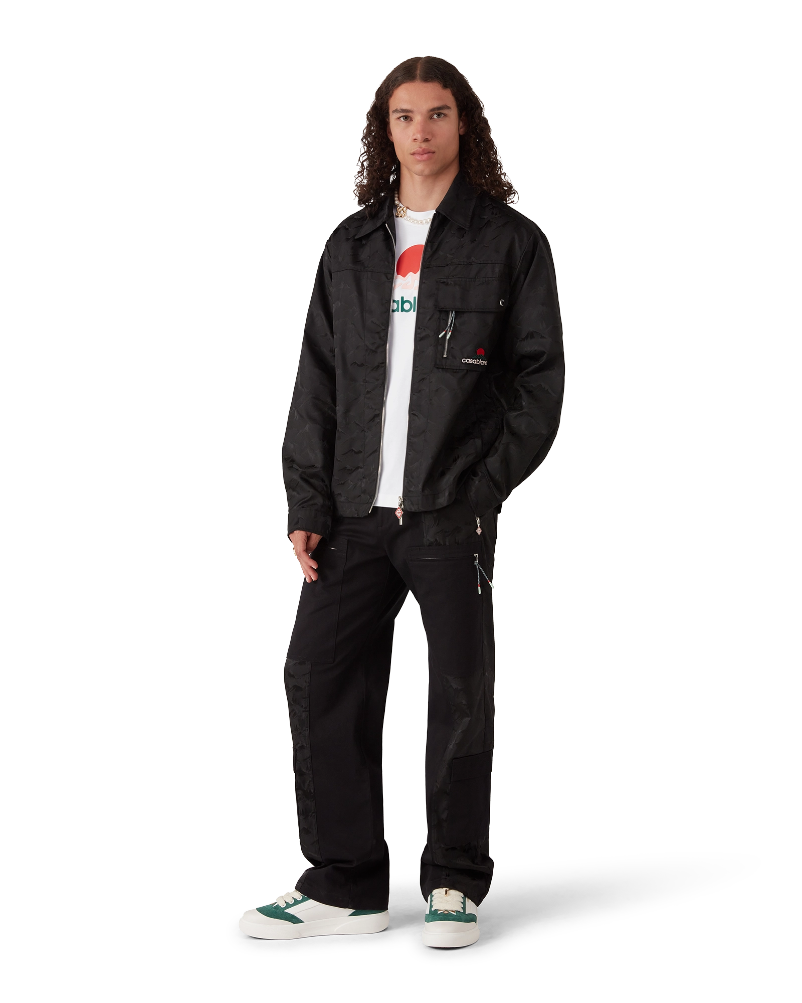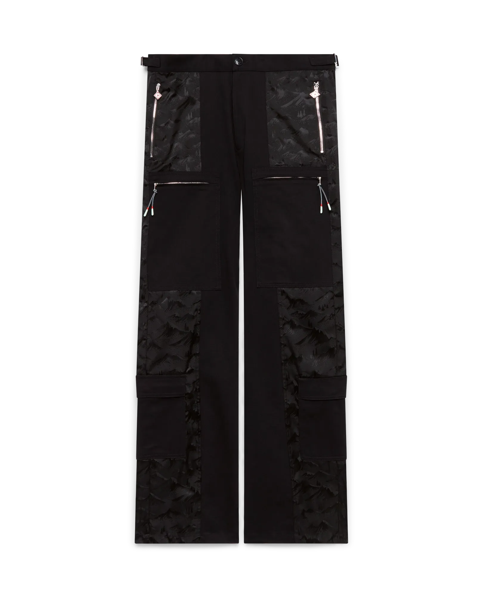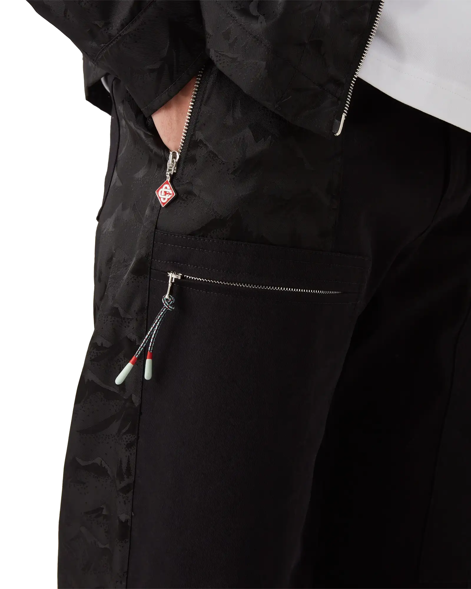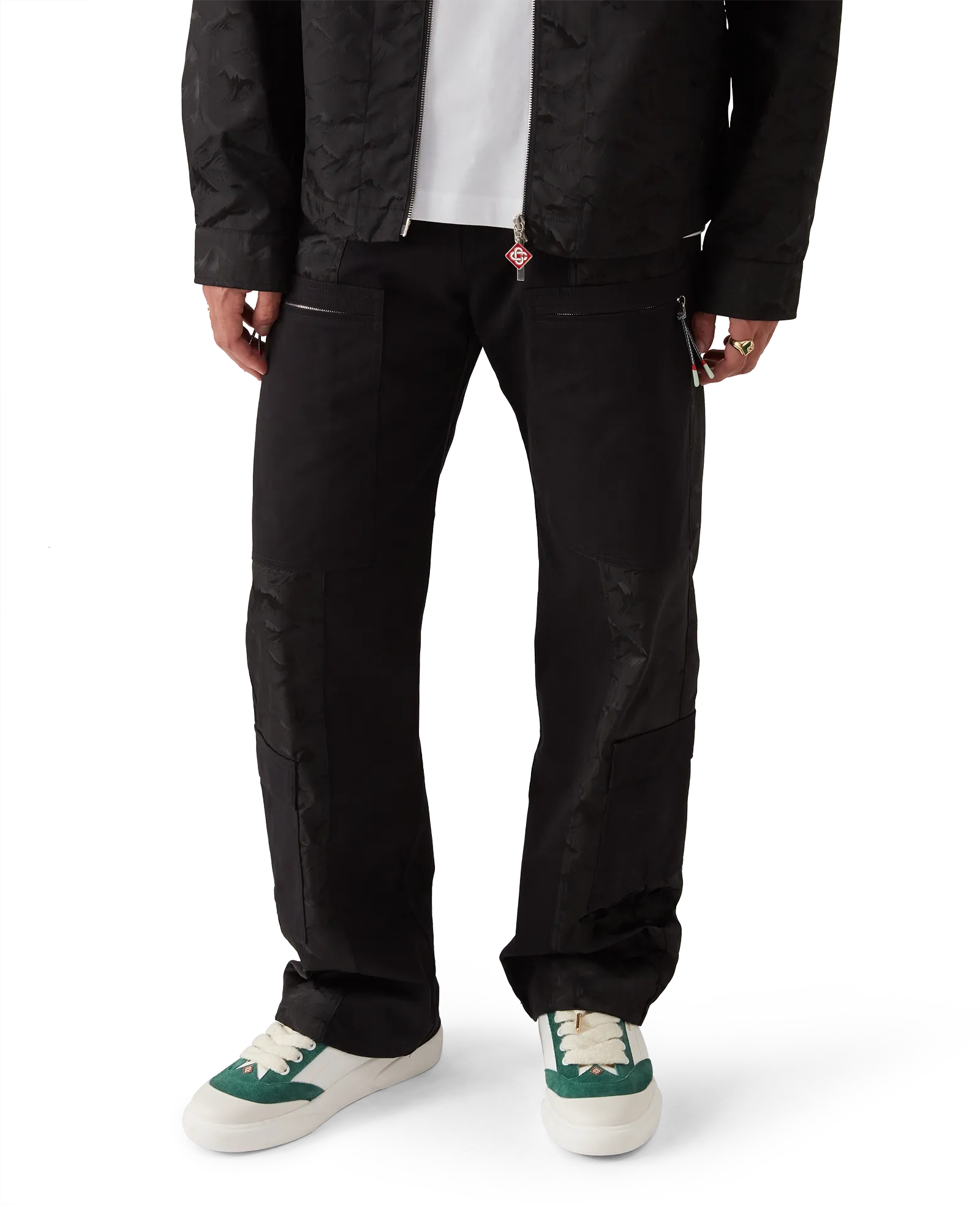 The nylon mountain camo cargo trousers are a straight-leg design crafted from jacquard nylon and cotton fabric. Completed with in-seam pockets with zip closures featuring the house’s signature diamond logo zipper tabs. a lining. patch pockets on the upper thighs with zip closures featuring mountaineering rope-inspired string tabs. flap pockets on the lower legs. back patch pockets. a zip closure. and side adjusters.
