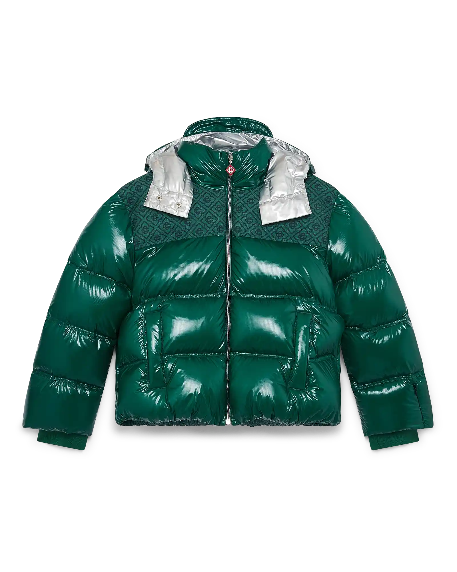 The nylon puffer jacket is a modern boxy outerwear design crafted from ripstop nylon fabric with down filling and contrasting monogram jacquard panel across the shoulders. Completed with a hood featuring CC logo toggles and drawstring fastenings. a stand-up collar providing extra warmth and protection against the elements. a zip closure with the house’s signature diamond logo zipper tab. front pockets with zip closure. branded adjustable cuff straps. and elasticised hem and cuffs.