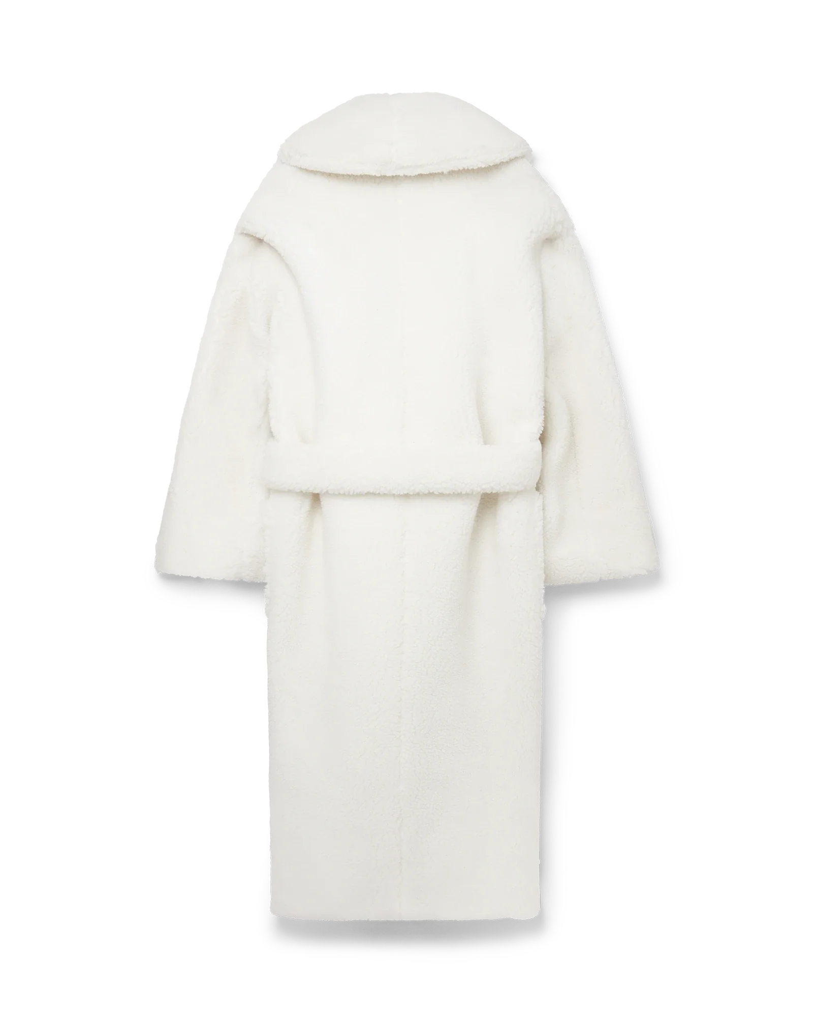 The off-white faux shearling robe coat is a long-sleeve design with a shawl collar. Crafted from the house’s signature faux shearling with lining. this piece features large side pockets and a belt with gold-plated metal buckle.