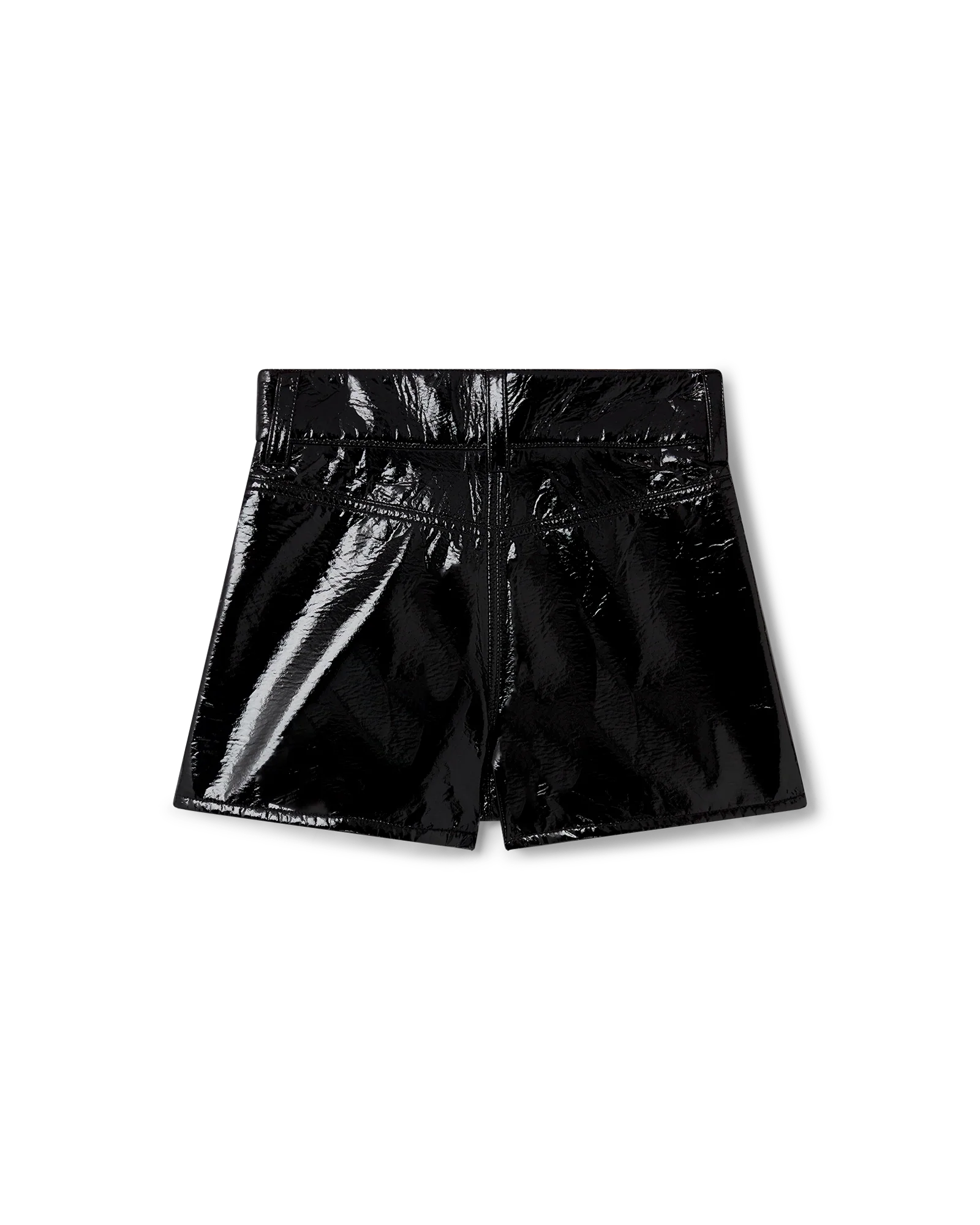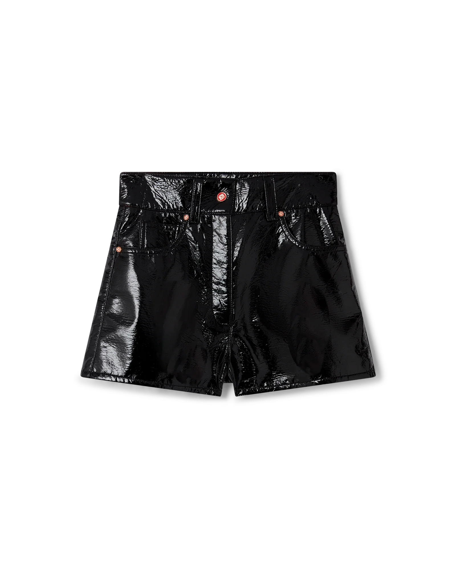 The patent shorts feature gold rim enamel hardware with the house’s signature logo. crafted from patent PU fabric. Completed with front pockets. a waistband with belt loops. and zip closure.
