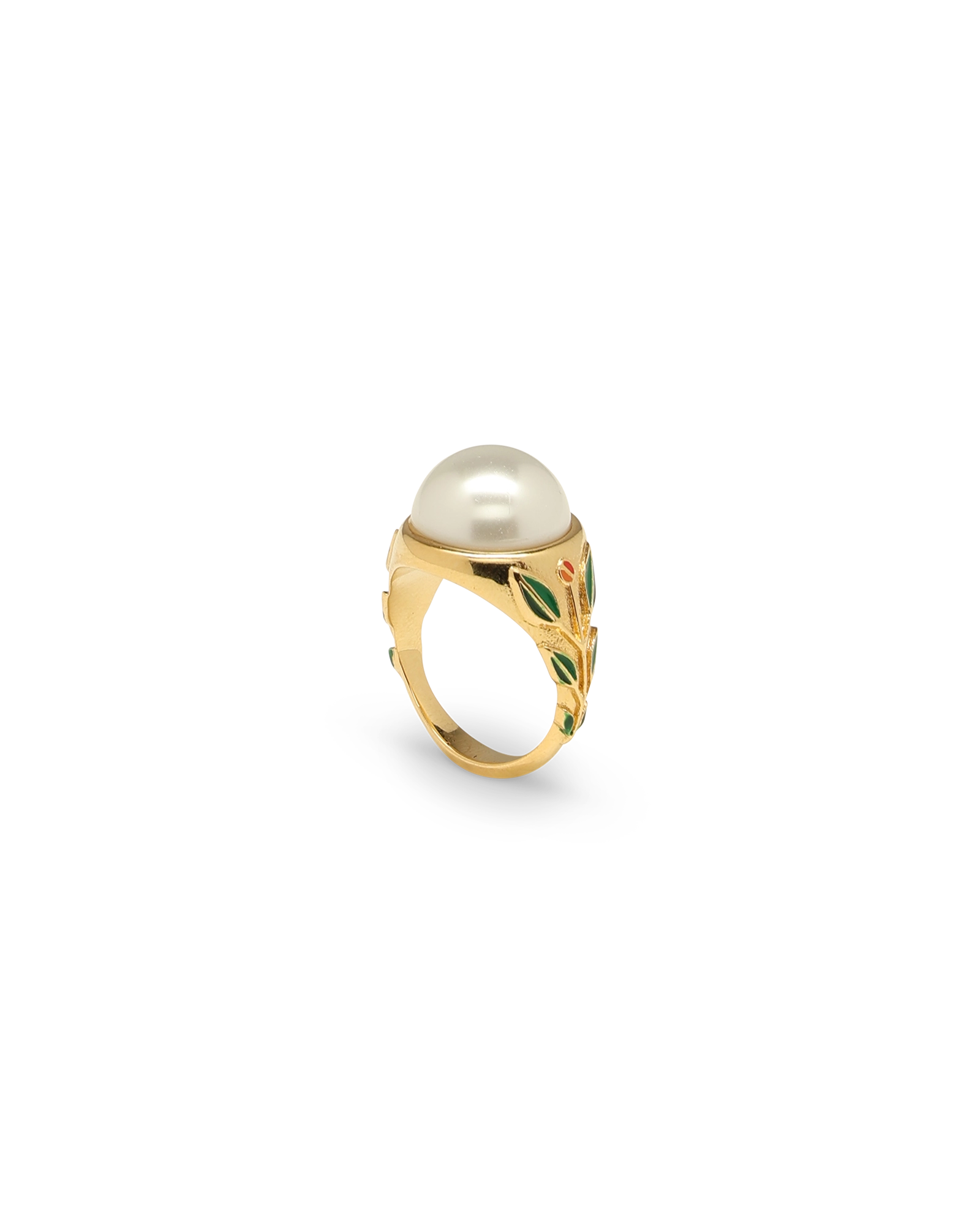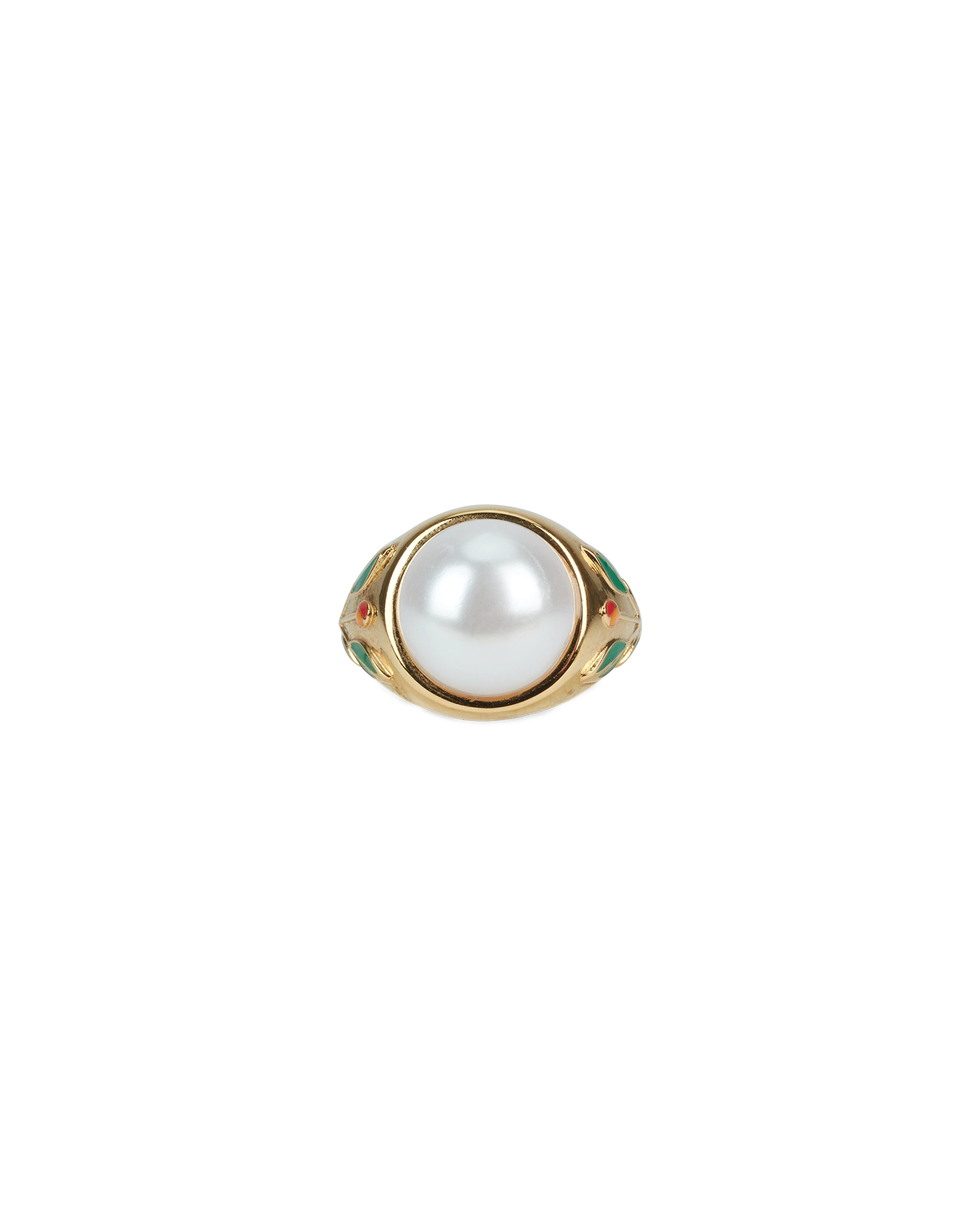 The Pearl Signet Ring is crafted from gold-plated brass. enamel and glass pearl cabochons. Complete with hand-painted floral detail on the shanks. this piece comes with a gift box. dust bag and product detail booklet.