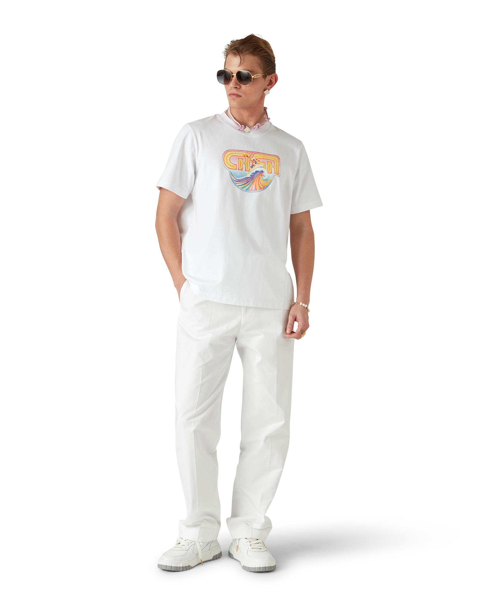 The pink knotted necklace is crafted from leather and freshwater pearls and features the house’s signature diamond logo. Completed with gold-plated lobster clasp and chain.