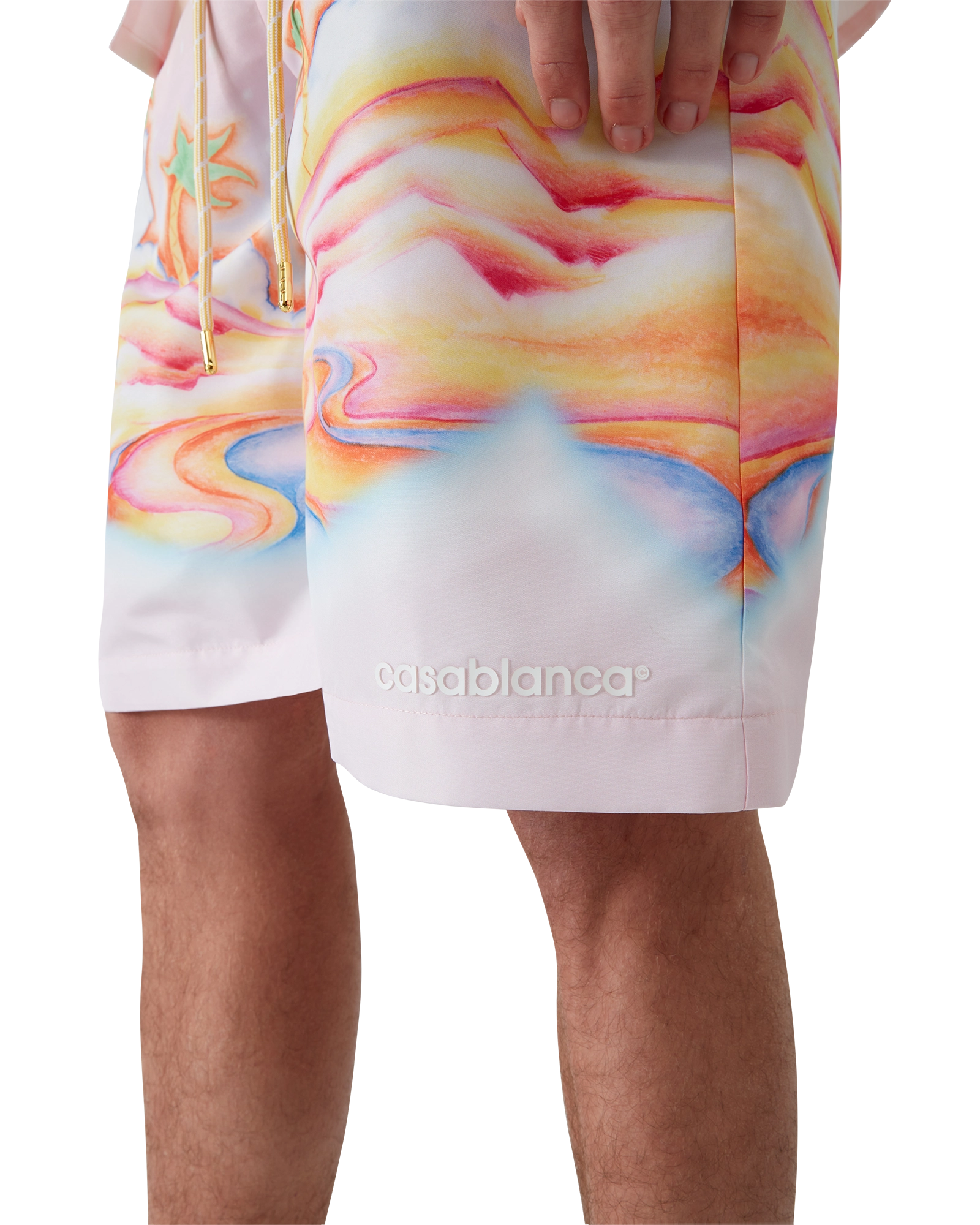 The Psychedelic Nirvana swim shorts are a knee-length design crafted from printed swim fabric featuring signature artwork inspired by ’70s airbrushed surfboards in California. using pastel colours that give the print an almost dream-like. idealistic feeling. Completed with an elasticated waistband. drawstring fastening. front pockets and a net lining.