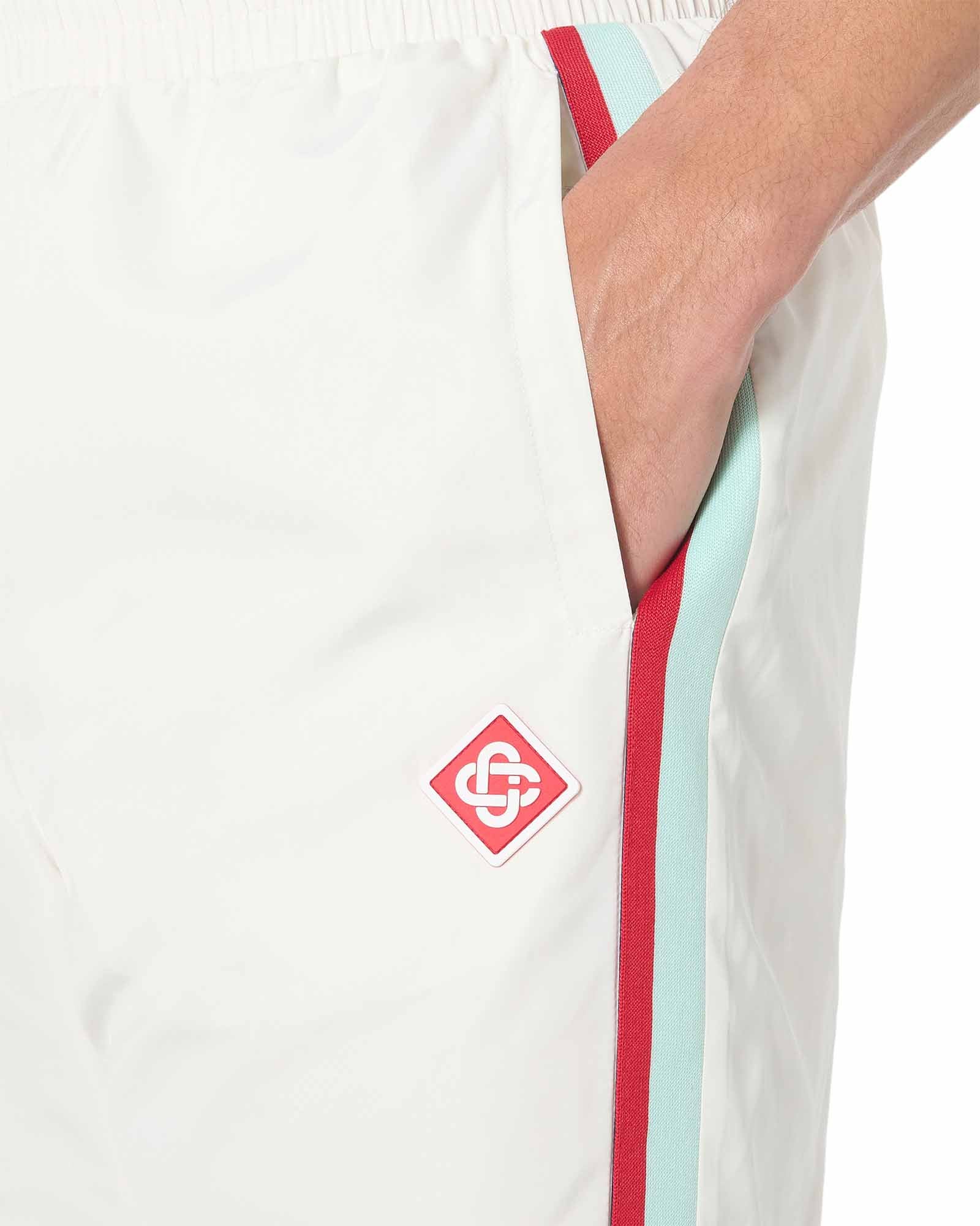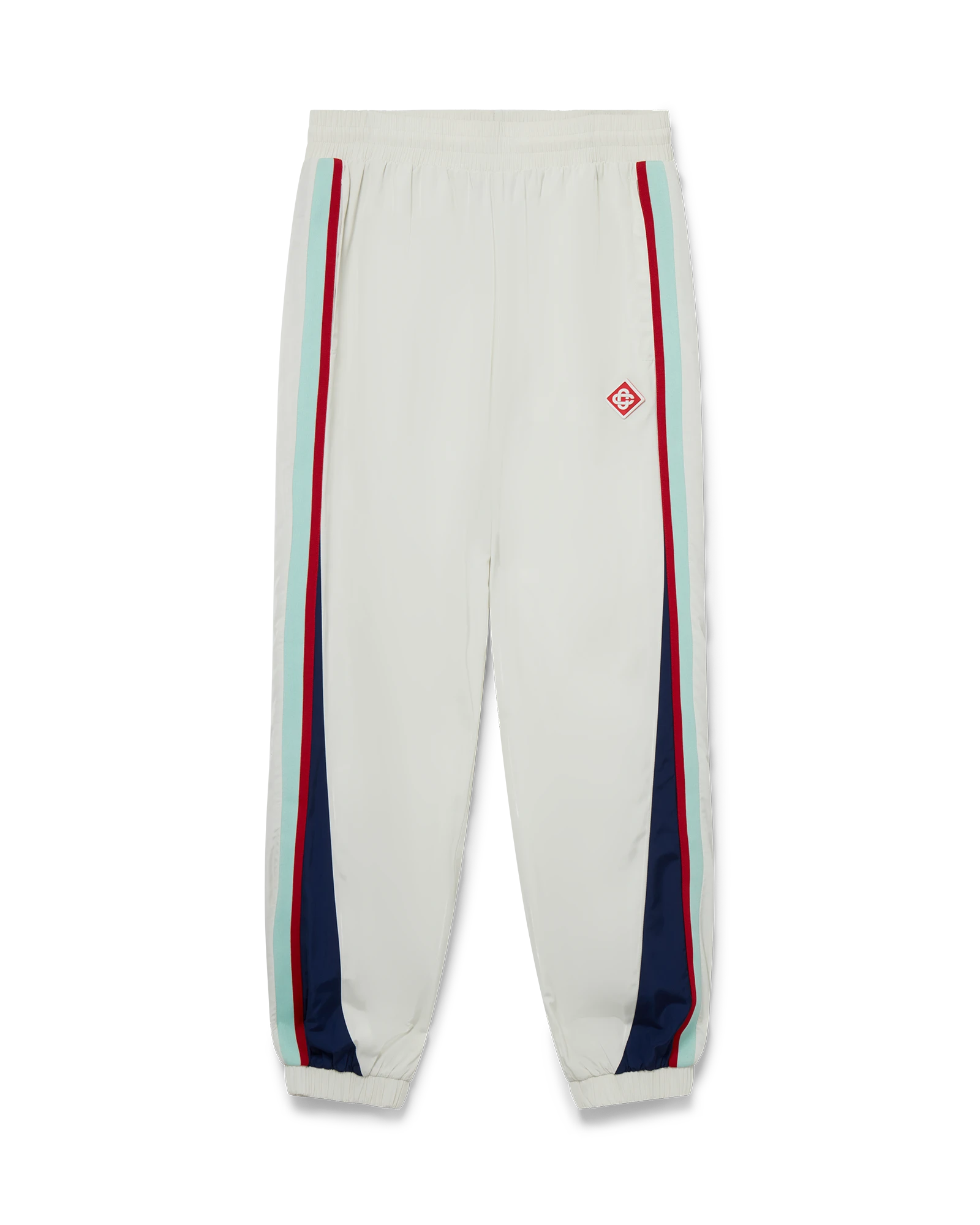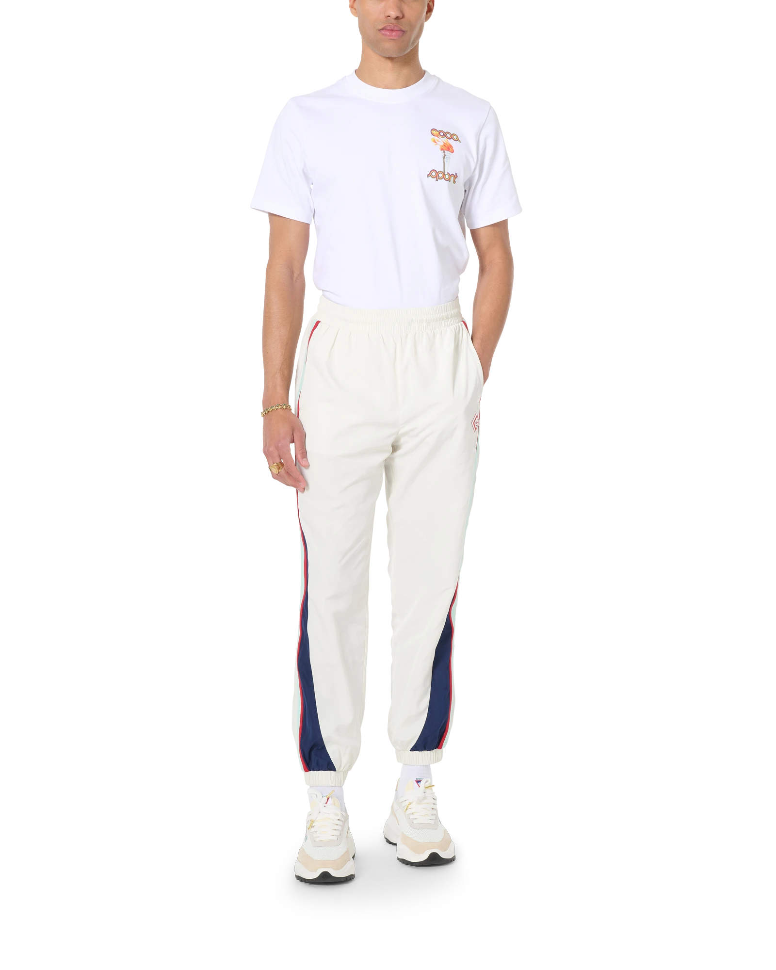 The side panelled shell suit track pants are a printed polyester sporting style incorporating Casablanca design codes. Completed with elasticated drawstring fastening and side pockets.
