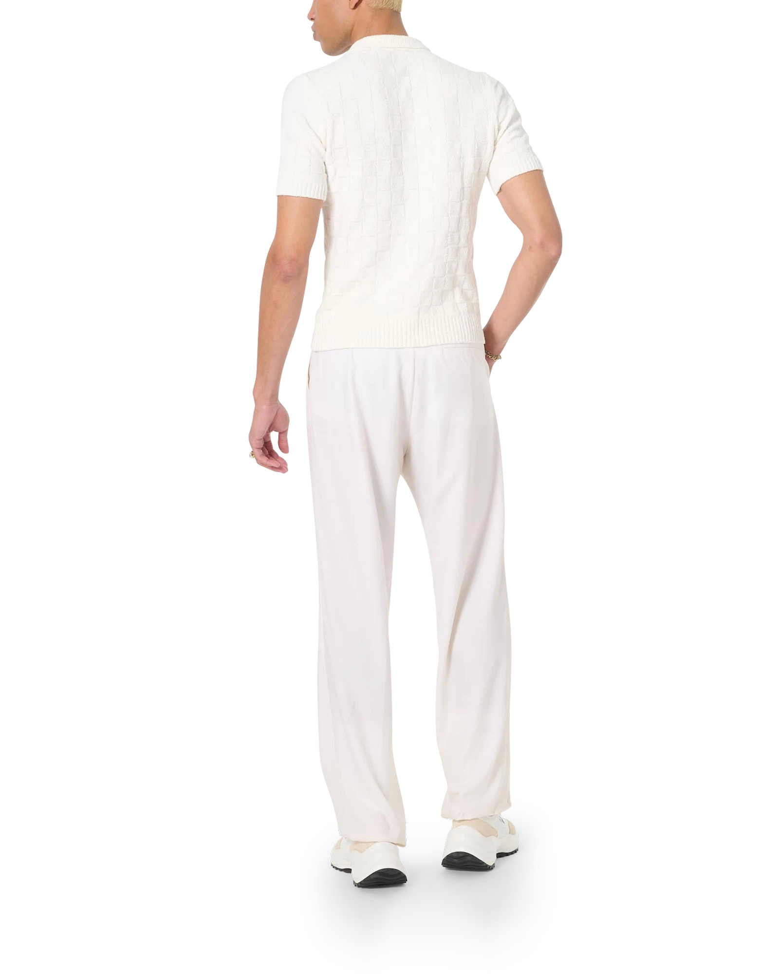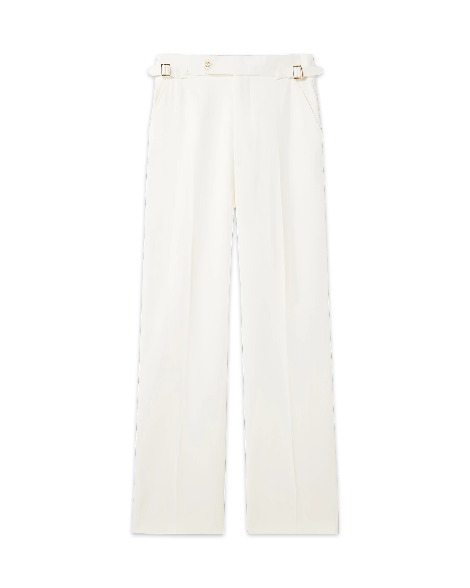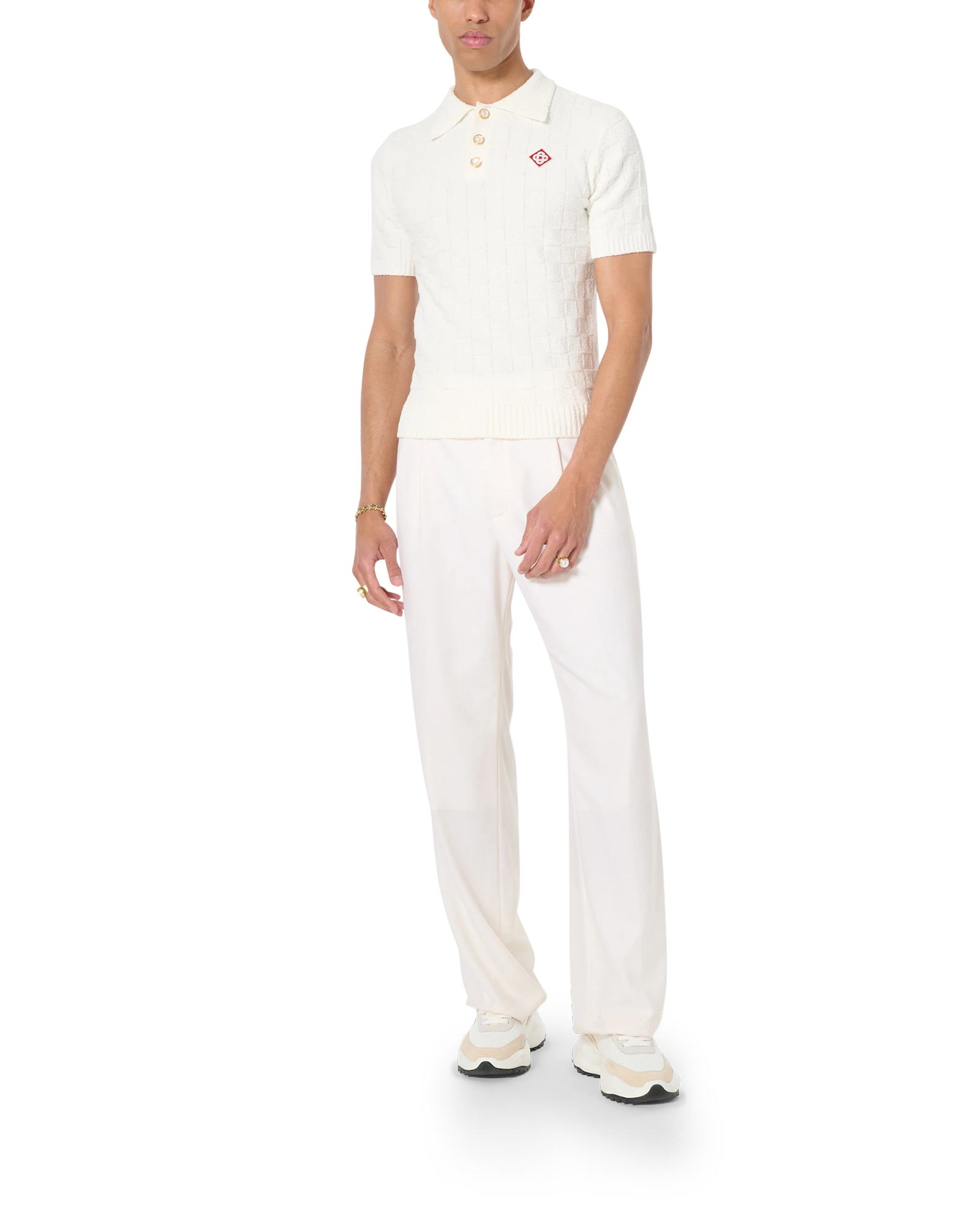 The Casablanca Straight Leg Trouser is a familiar silhouette with a classic fit and slanted pockets. Finished with gold-coloured side adjusters. and the house’s signature enamel and pearl button.