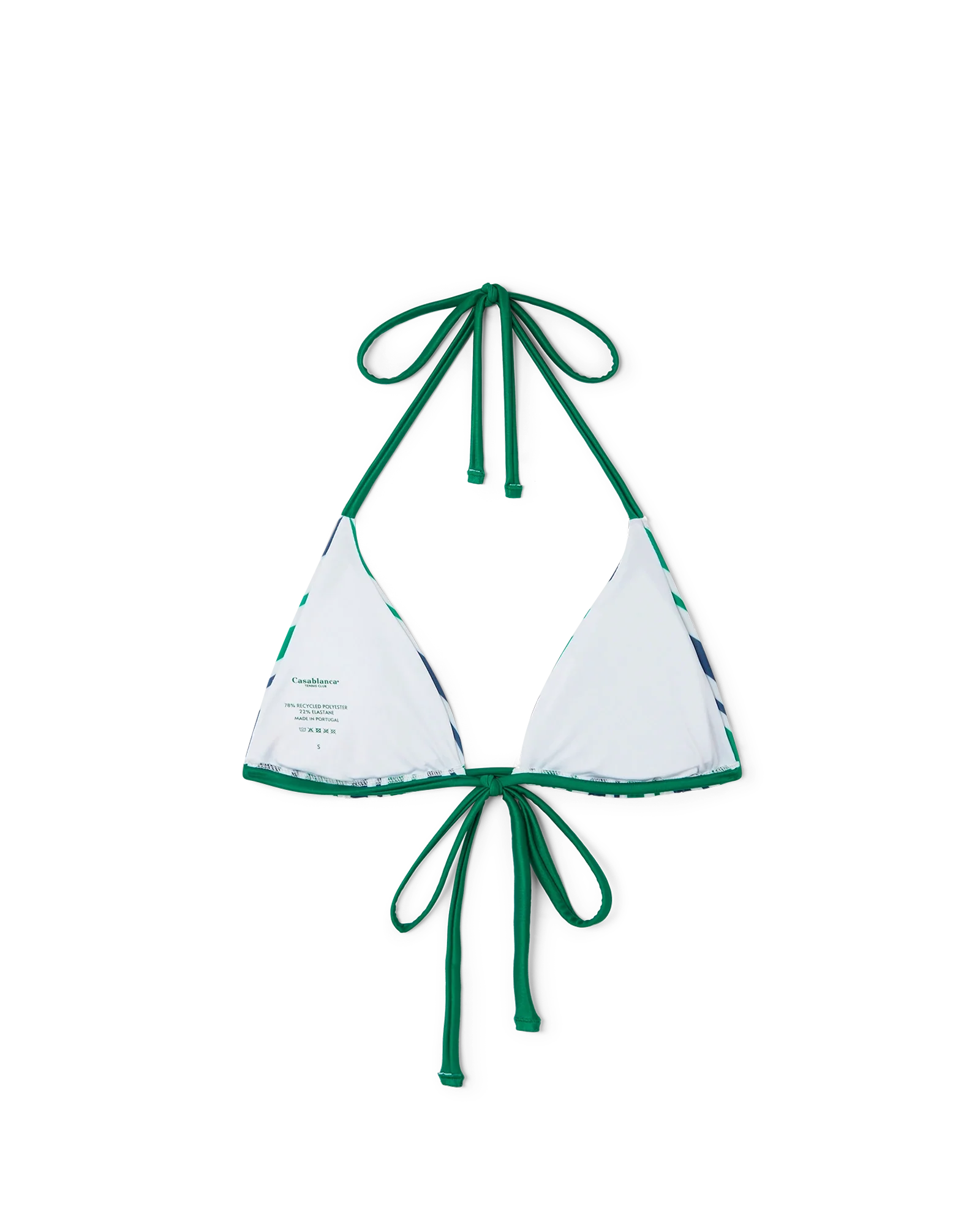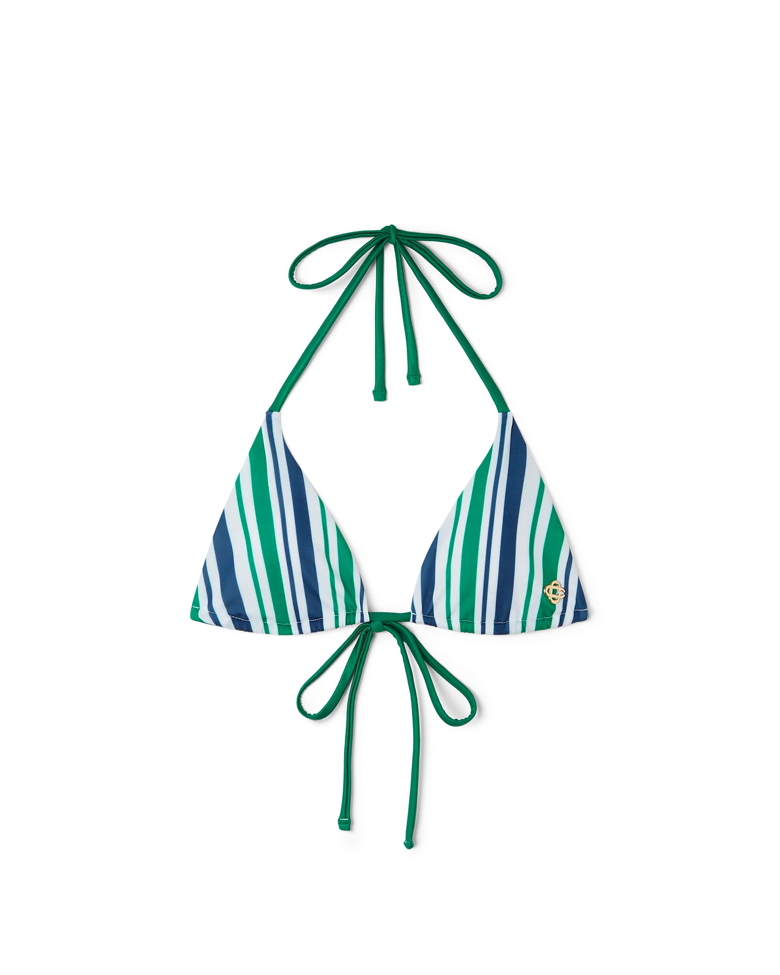 The striped string bikini top is a triangular-shaped style featuring seasonal colour codes with green string fastening at the neck and back. This piece is completed with removable padding and is intended to be worn with its coordinating bottoms.