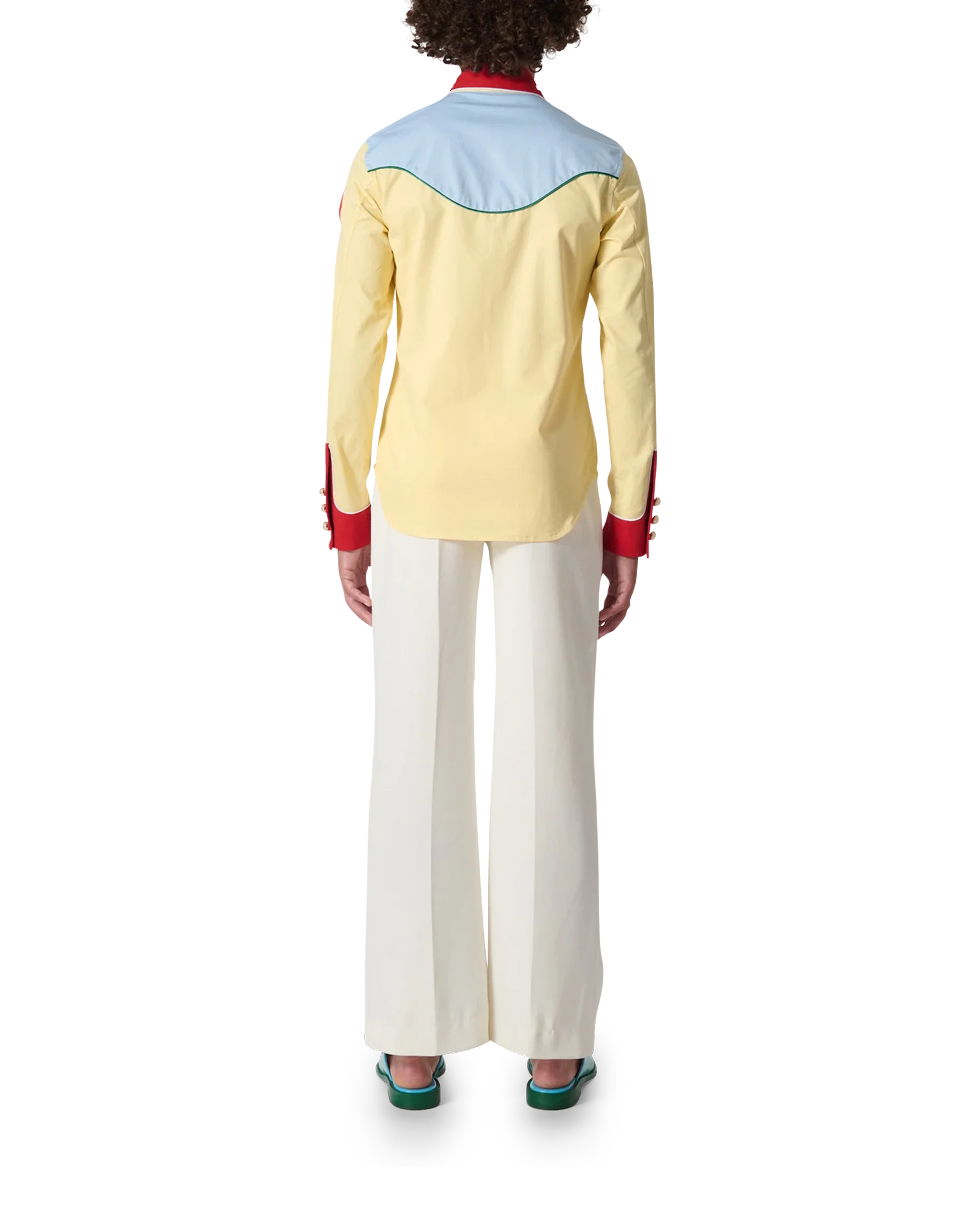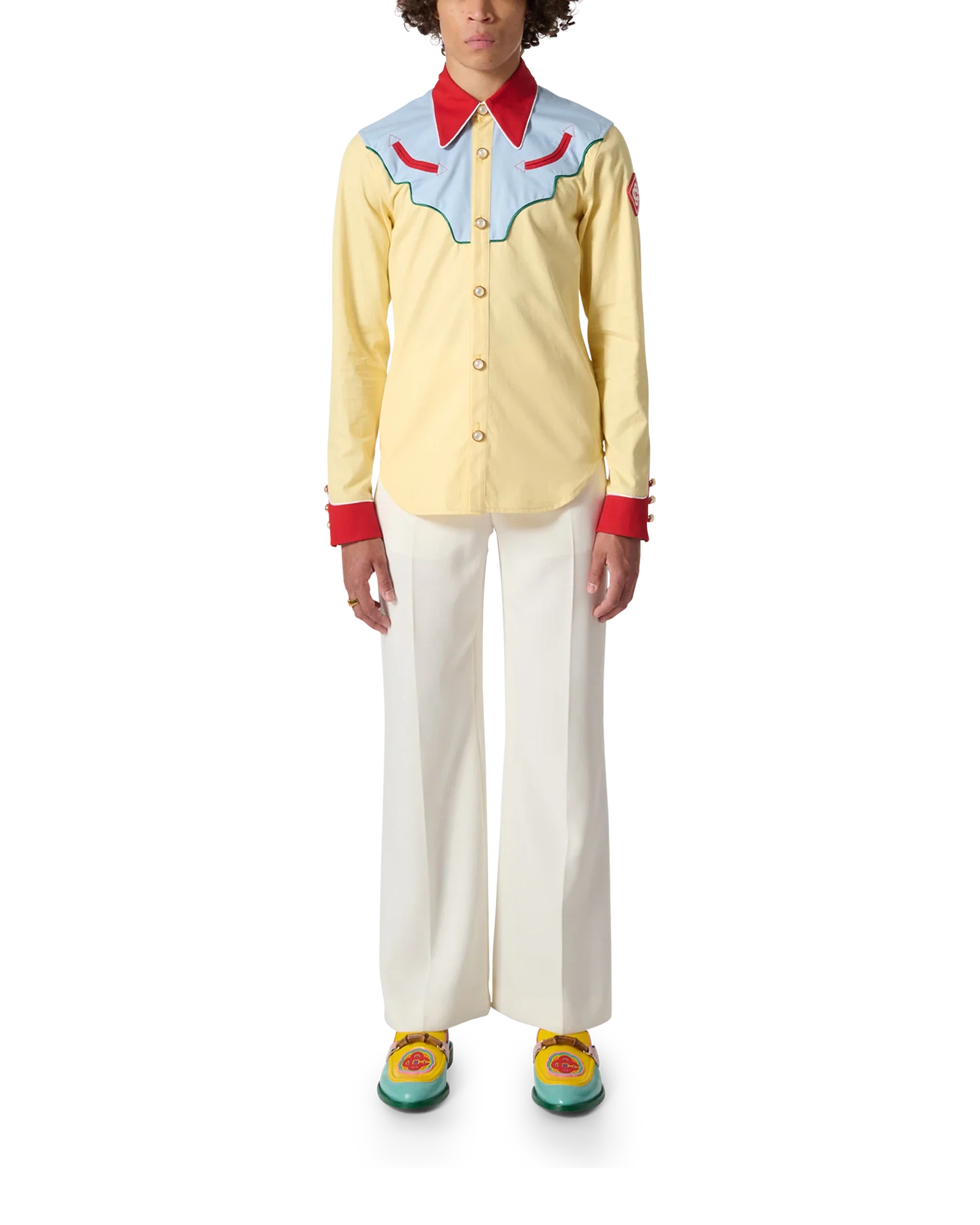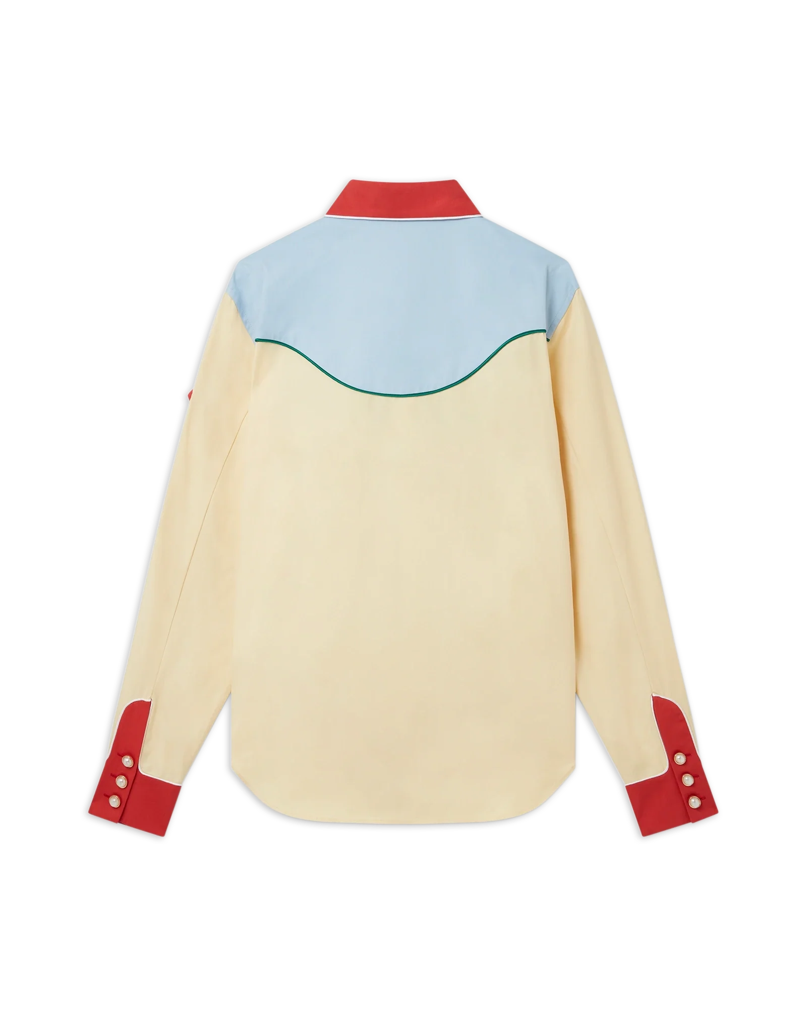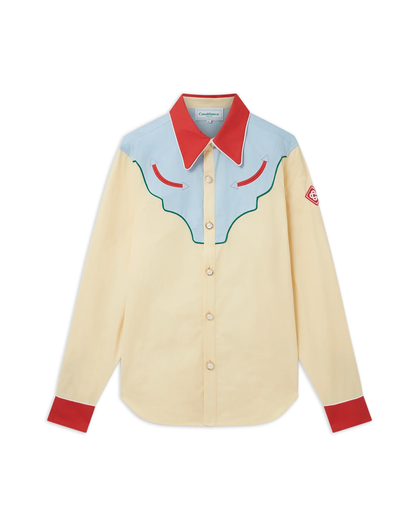 The Western Shirt is a cotton twill shirt incorporating seasonal Casablanca design codes. Completed with a contrast red collar and hem. and signature gold rim pearl buttons. Designed for a classic fit.