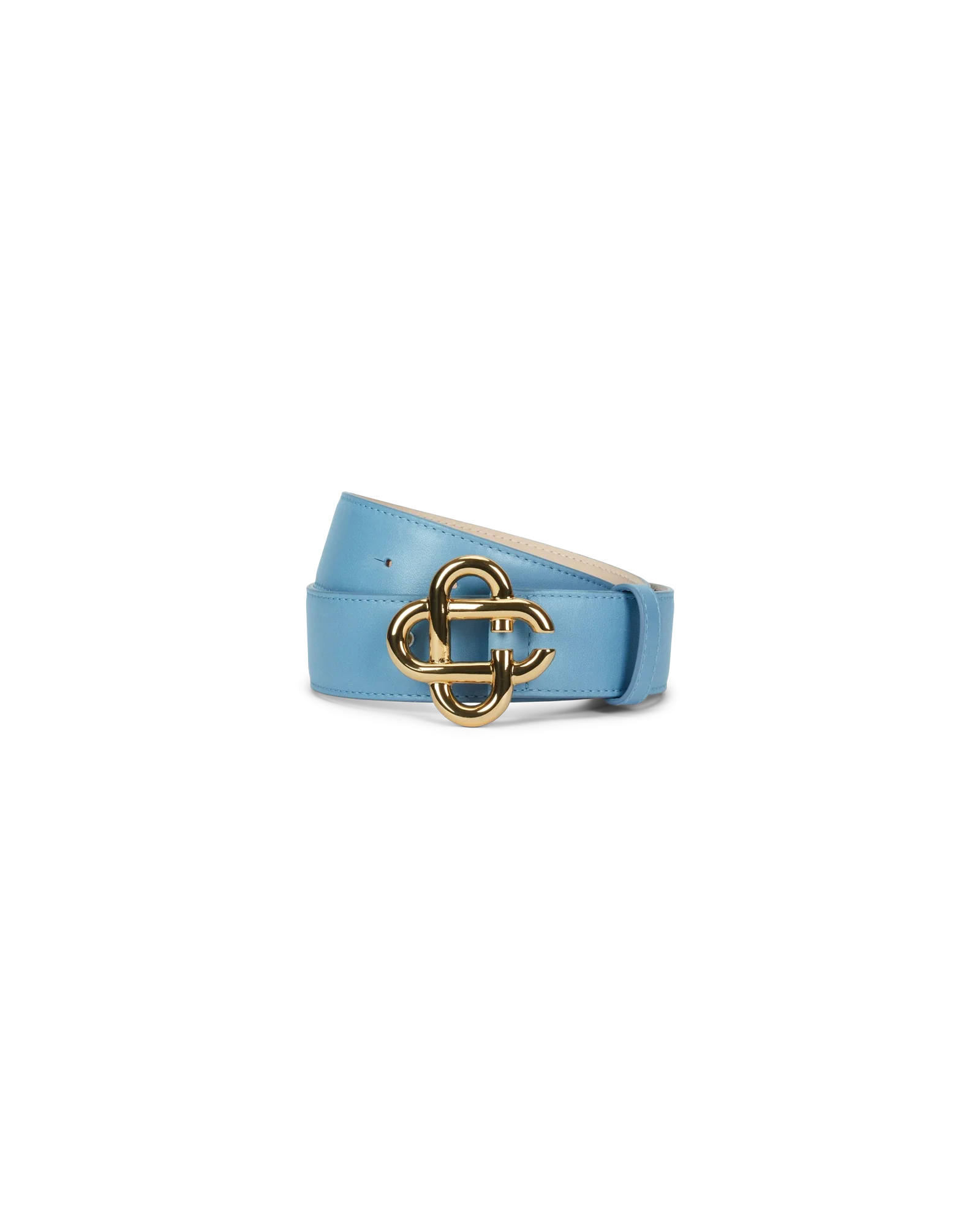 The womens blue CC logo buckle belt is the house’s signature interlocking buckle belt with a leather strap in blue.