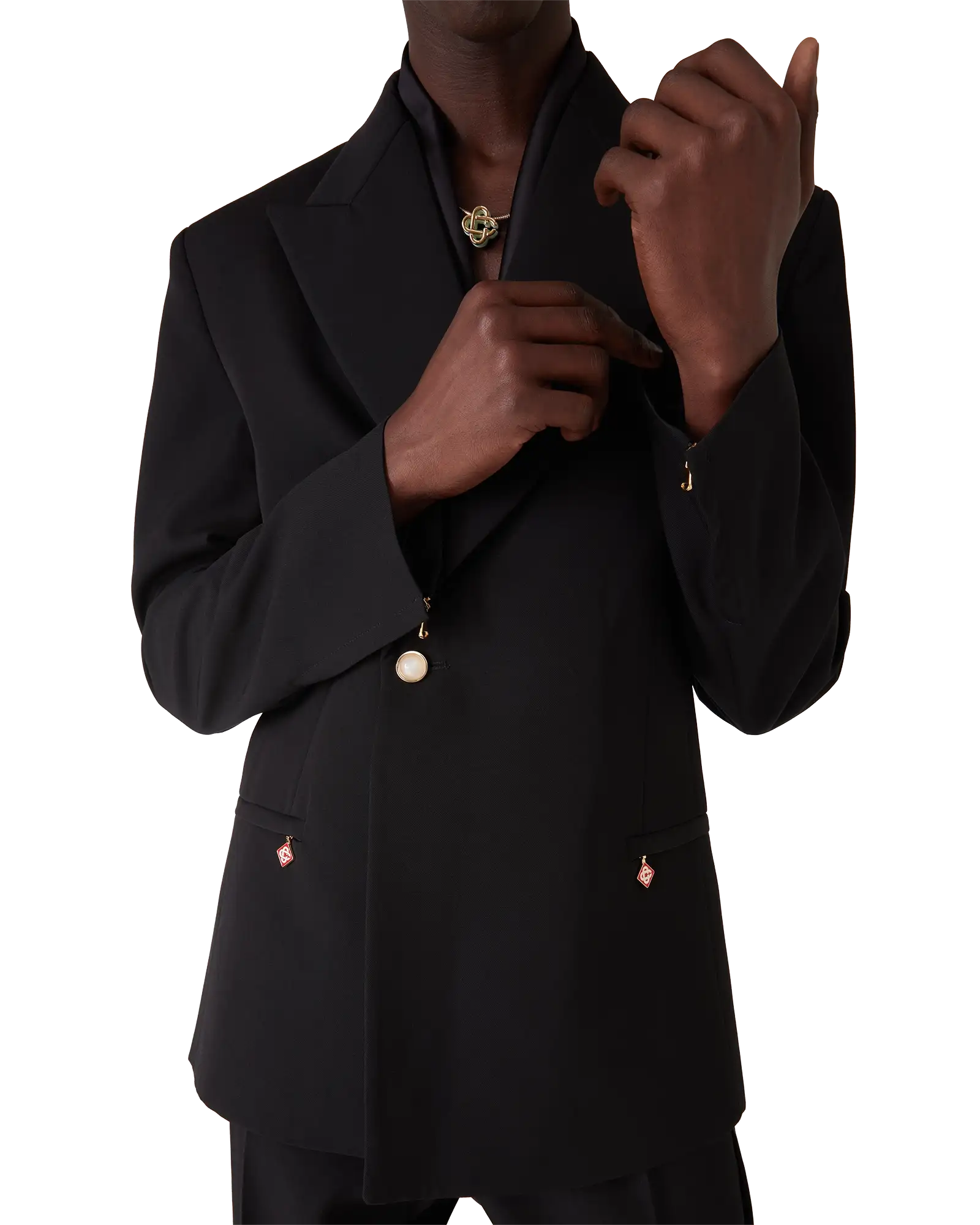 The wool double-breasted jacket is a tailored design crafted from wool fabric. Completed with peak lapels. an inner satin shawl collar detail. a zip and signature gold rim pearl button closure. zip cuffs. welt pockets with zip closure. a breast pocket. internal pockets. and a vent.