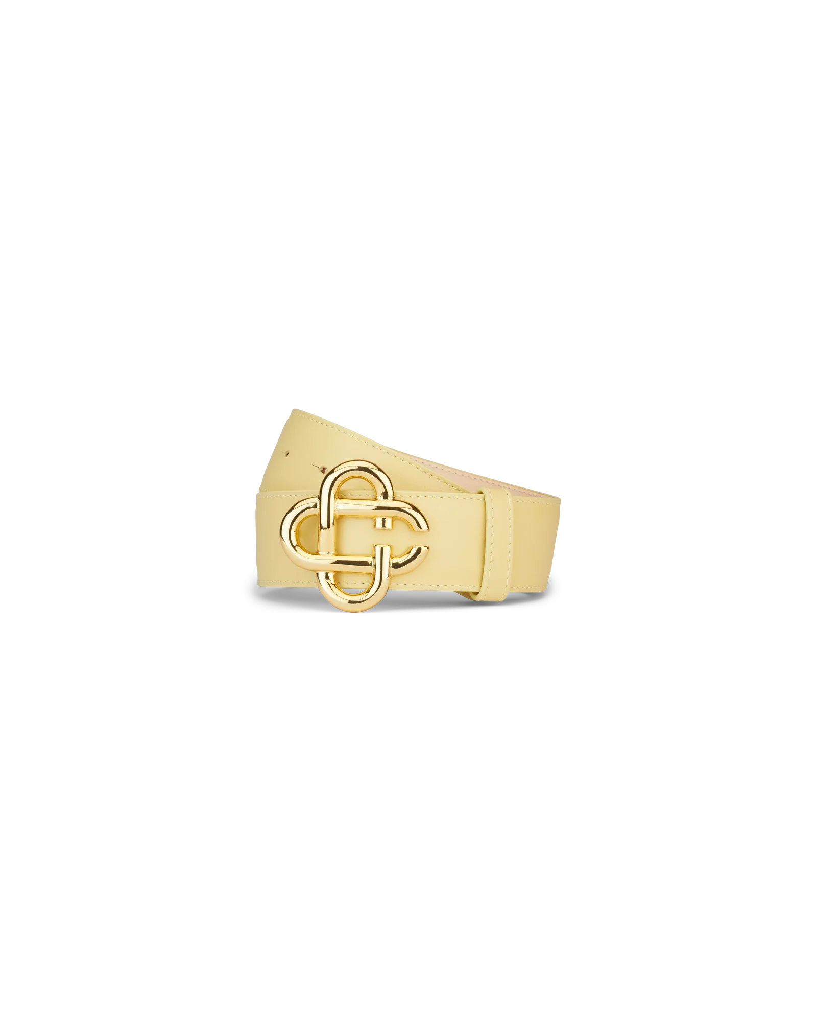 The yellow leather belt features the house’s signature interlocking cc logo buckle with a calf leather strap.